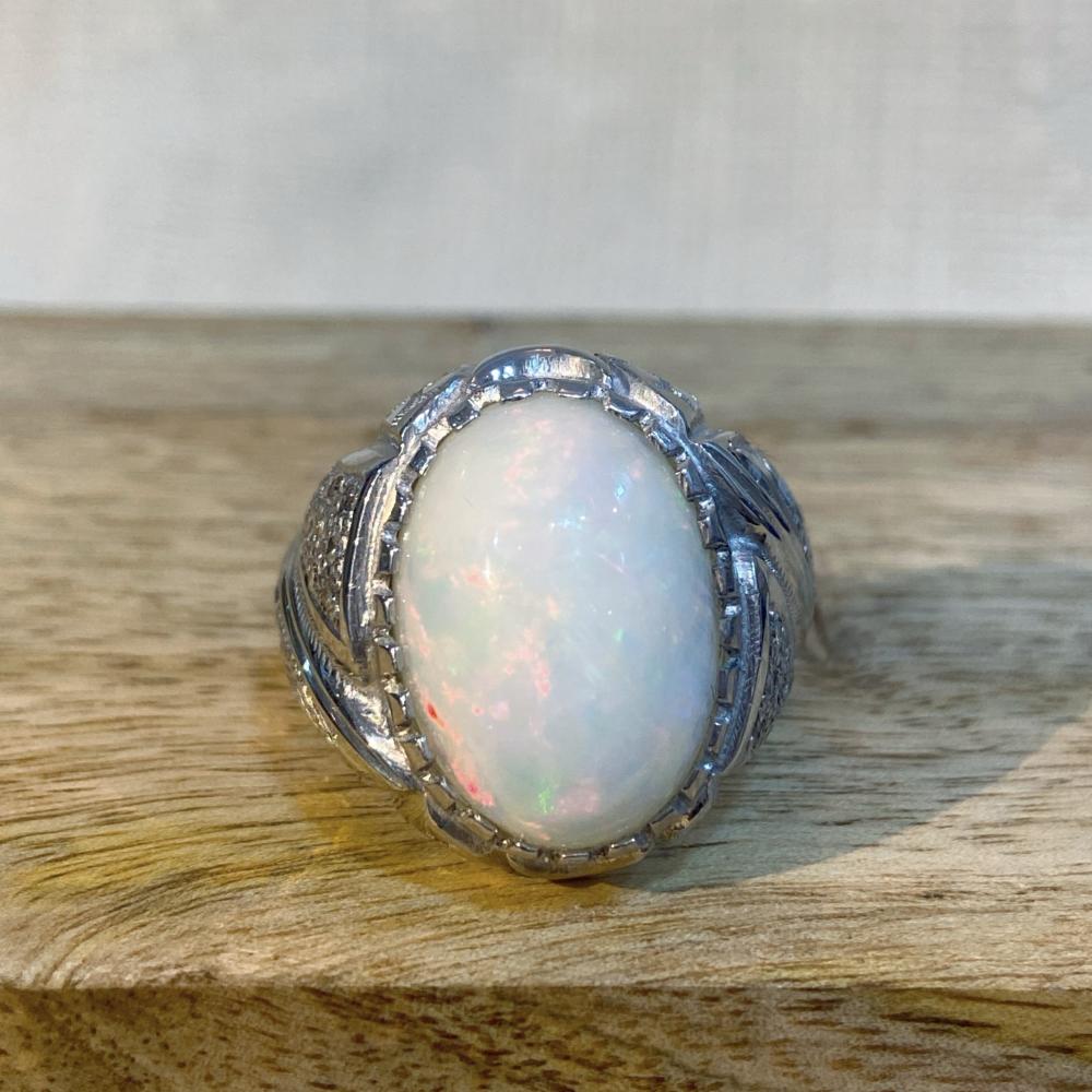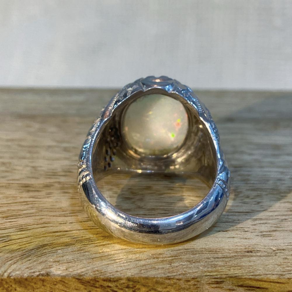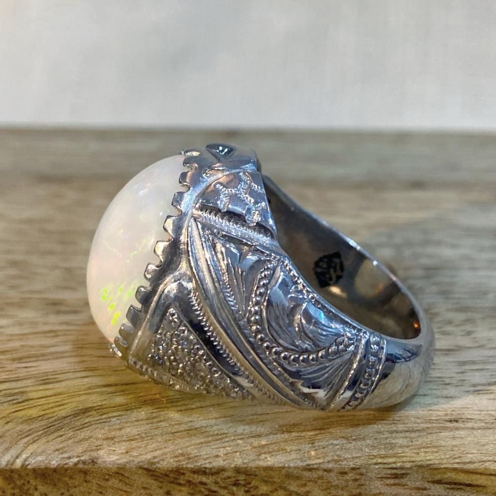 خاتم رجالي فاخر يتوسطه حجر أوبال أثيوبي طبيعي بلمعانه المتغير ولونه المميز، مرصع بفصوص ألماس براقة على قاعدة من فضة عيار 950 بتصميم شرقي أنيق يناسب الرجل ذو الذوق الرفيع. قطعة فاخرة تعكس الفخامة والجاذبية وتضيف لمسة راقية لإطلالتك اليومية والمناسبات الخاصة.