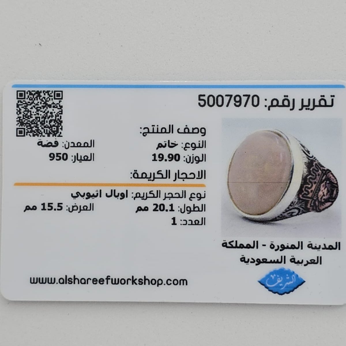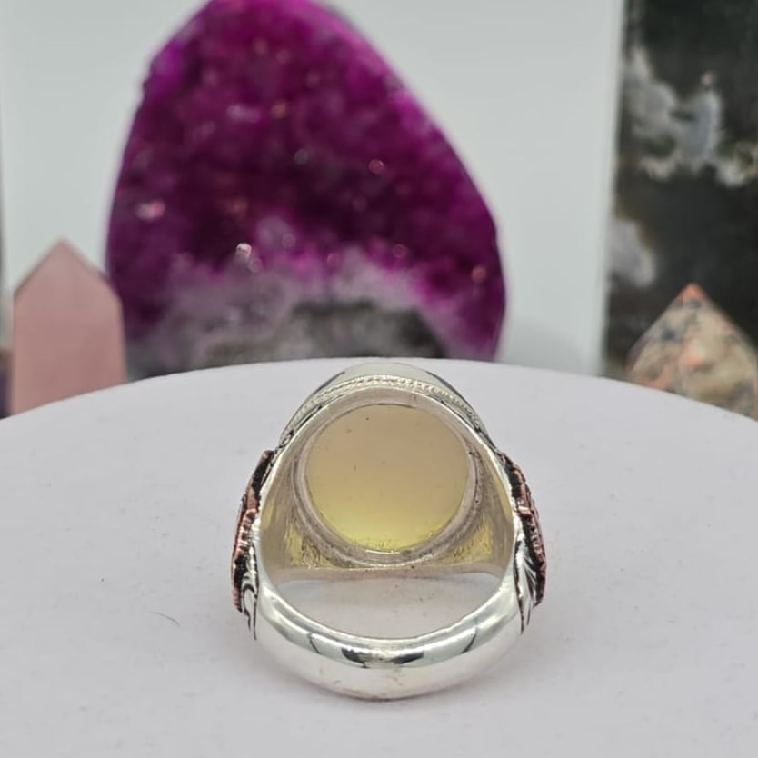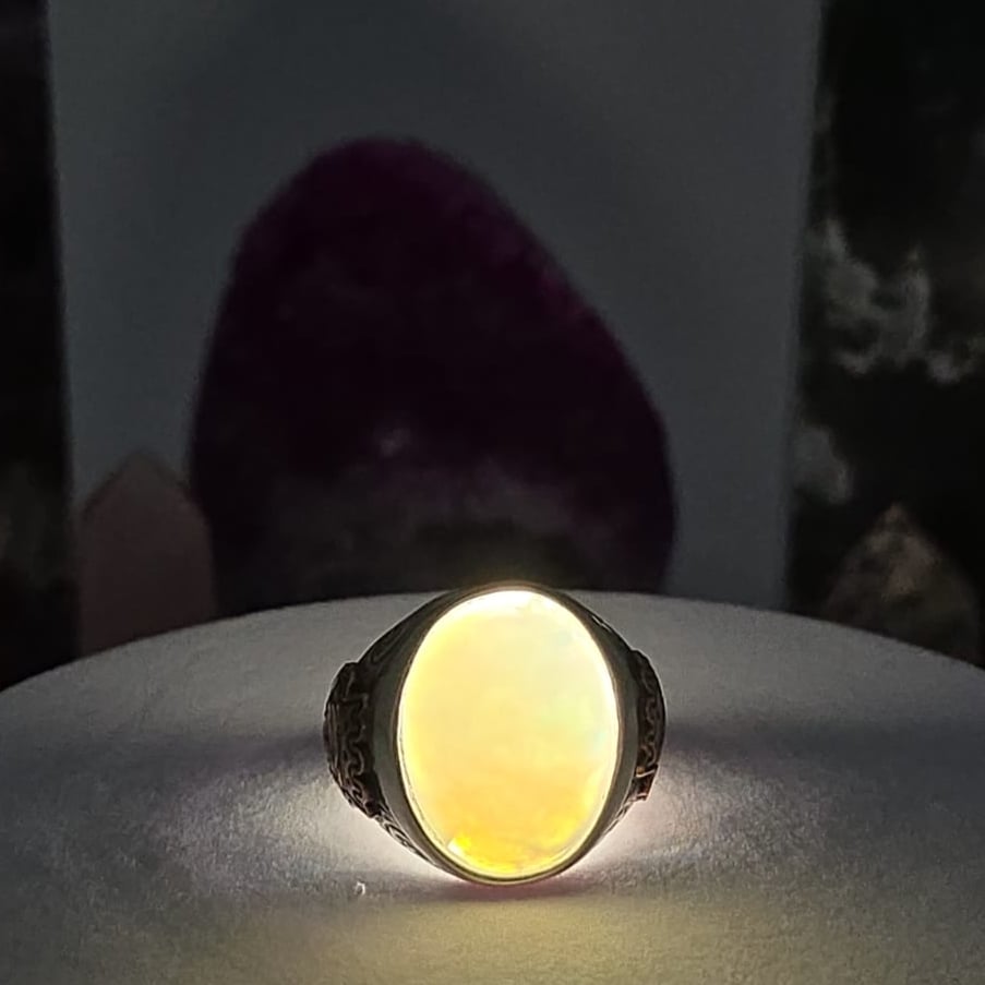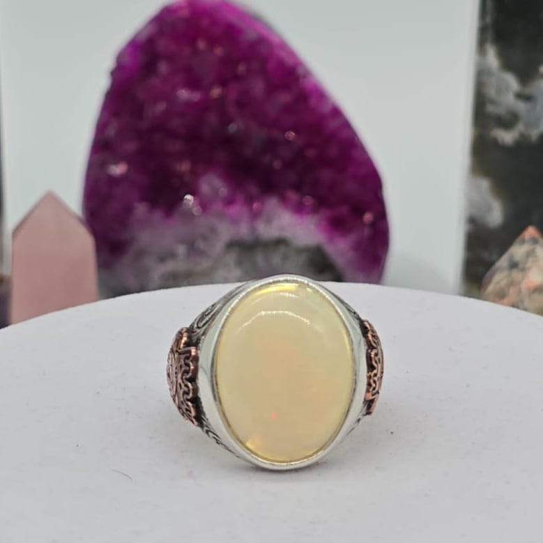 خاتم رجالي فخم يتوسطه حجر أوبال أثيوبي طبيعي معروف بألوانه النارية المتغيرة تحت الإضاءة، ومصاغ على قاعدة من فضة عيار 950 بتصميم شرقي أنيق يليق بالرجل ذو الذوق الرفيع. قطعة استثنائية مميزة بنشقة اسد من النحاس تعبّر عن التفرد والفخامة، وتضفي حضورًا لافتًا سواء في الإطلالة اليومية أو المناسبات الخاصة.