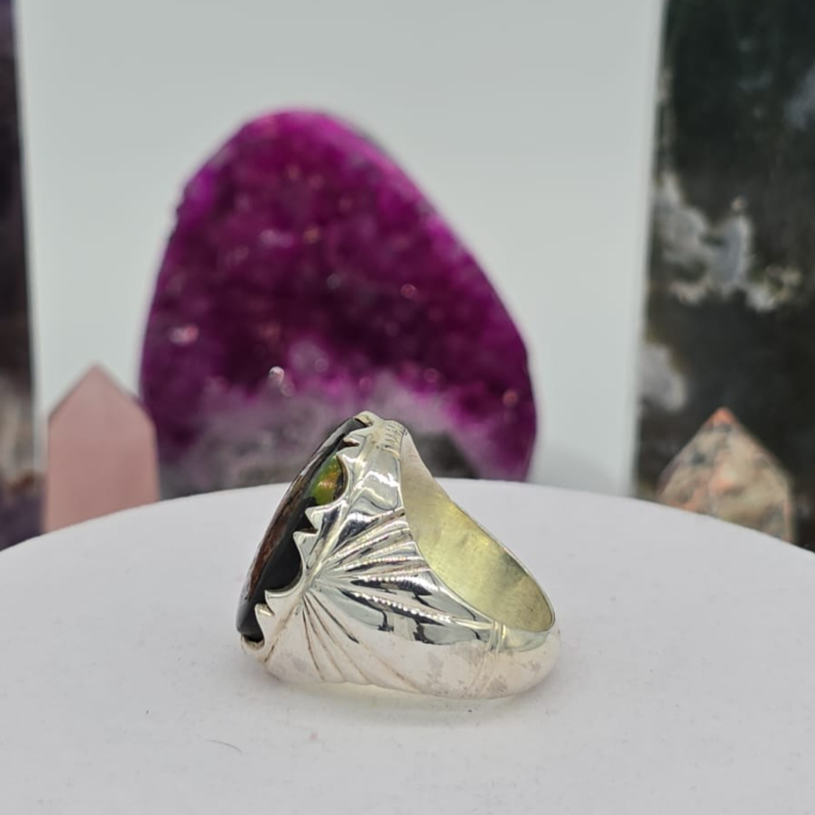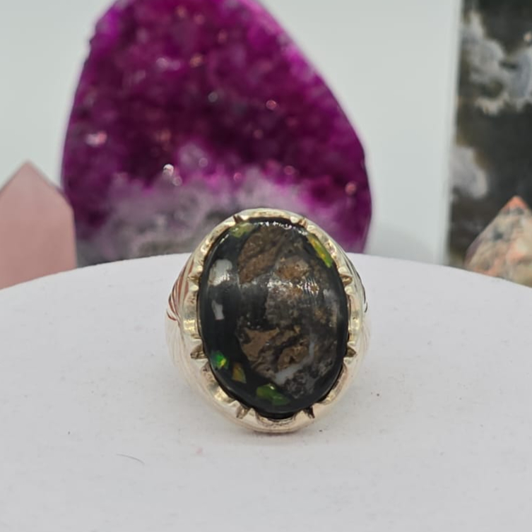 خاتم رجالي فاخر مرصع بحجر البولدر أوبال الطبيعي المعروف بتدرجات ألوانه الخلابة ولمعانه الناري الفريد.