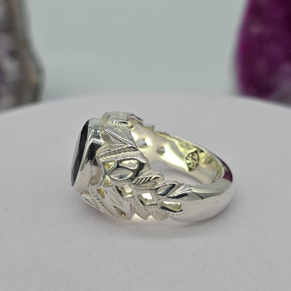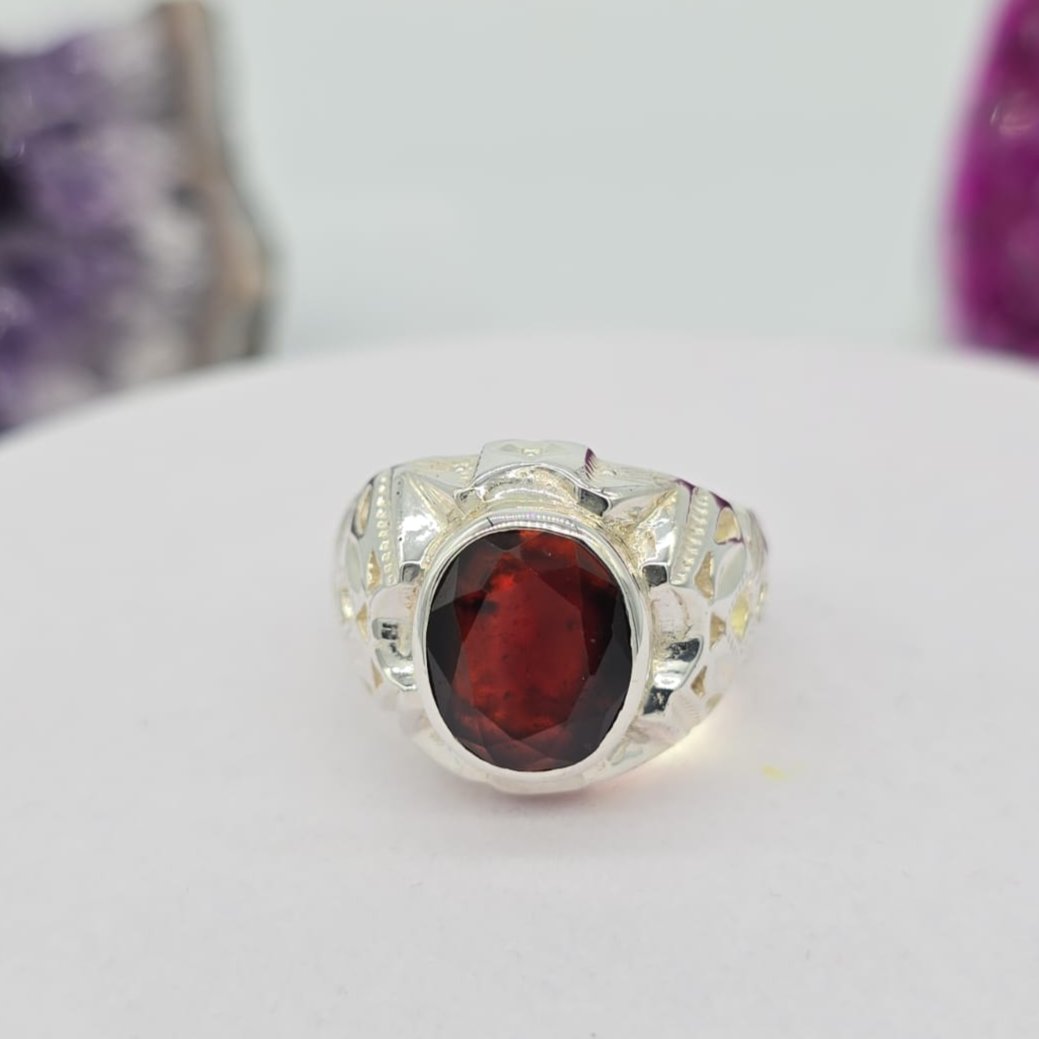 خاتم رجالي فاخر يتوسطه حجر جارنيت طبيعي أحمر بلونه العميق الساحر الذي يرمز إلى القوة والجاذبية, مصاغ على قاعدة من فضة عيار 950 بتصميم أنيق يُبرز جمال الحجر ويمنحه حضورًا مميزًا.