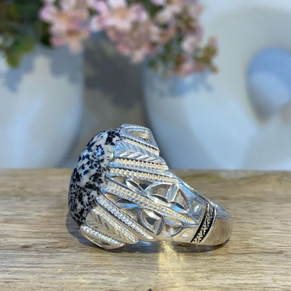 خاتم رجالي أنيق يتوسطه حجر طبيعي نادر يُعرف باسم حجر جلد الحية، يتميز بتدرجات وأشكال طبيعية فريدة تُشبه جلد الأفعى.