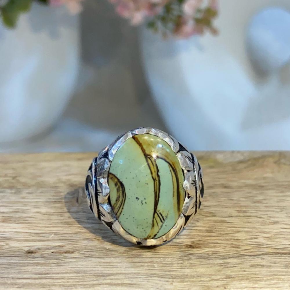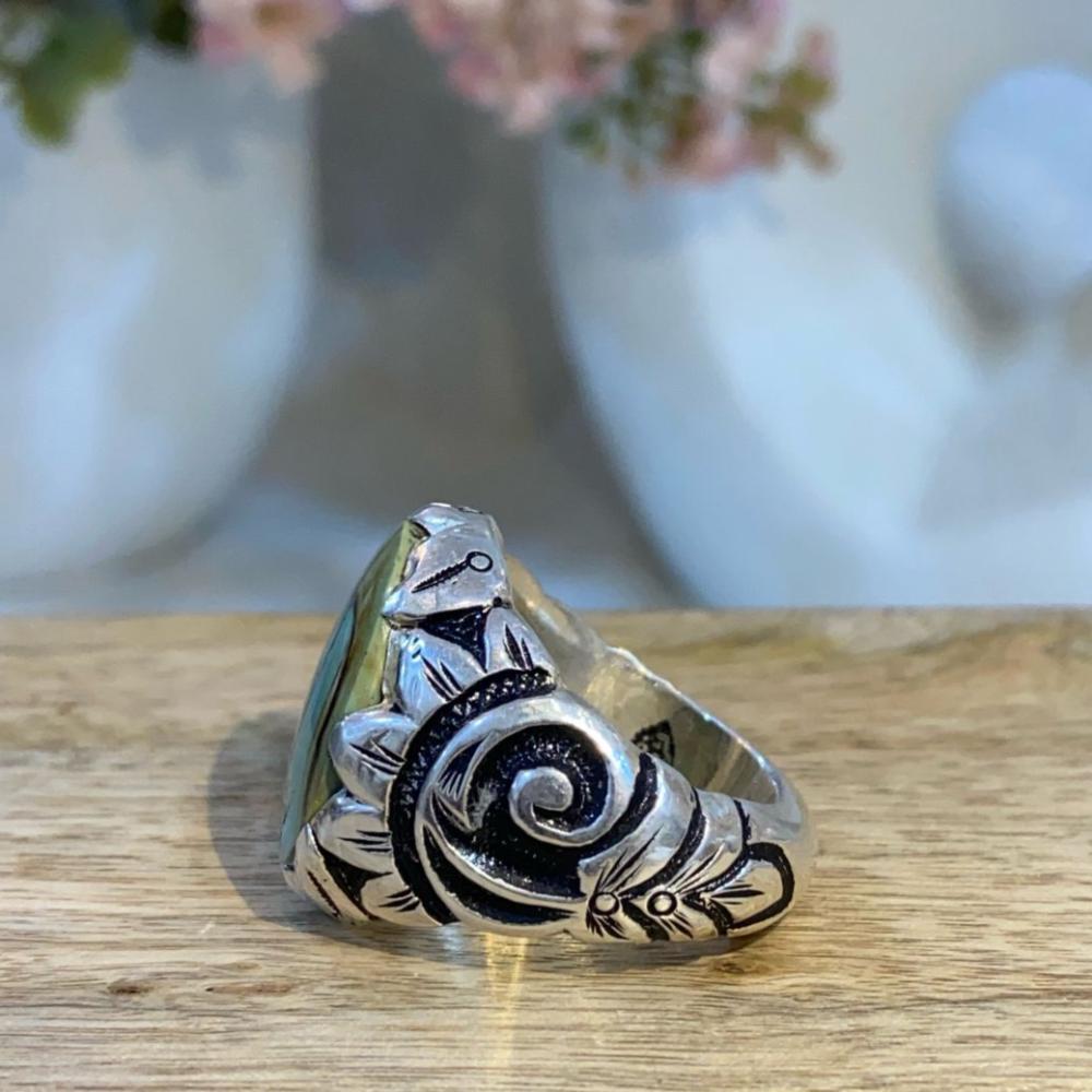 خاتم رجالي أنيق يتوسطه حجر الدم الطبيعي المصاغ على قاعدة من الفضة الخالصة عيار 950.