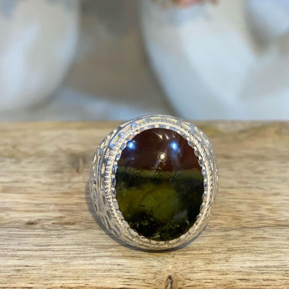خاتم رجالي أنيق يتوسطه حجر الدم الطبيعي المصاغ على قاعدة من الفضة الخالصة عيار 950.