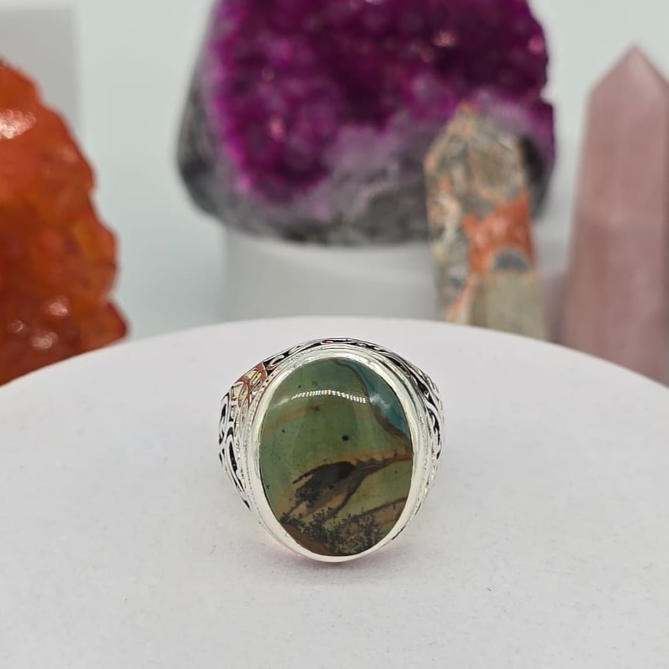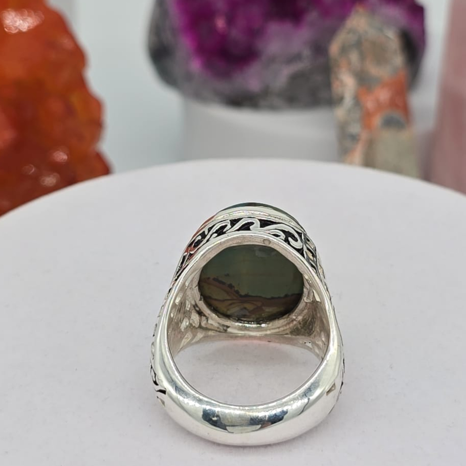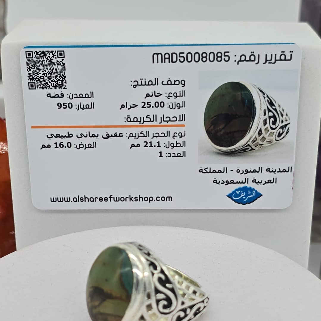 خاتم رجالي أنيق يتوسطه حجر الدم الطبيعي المصاغ على قاعدة من الفضة الخالصة عيار 950.