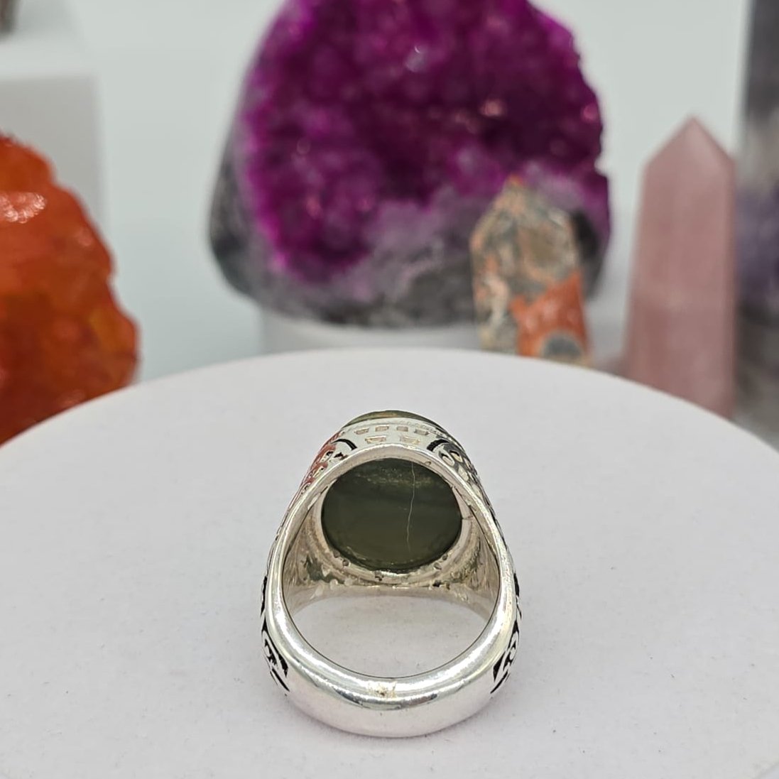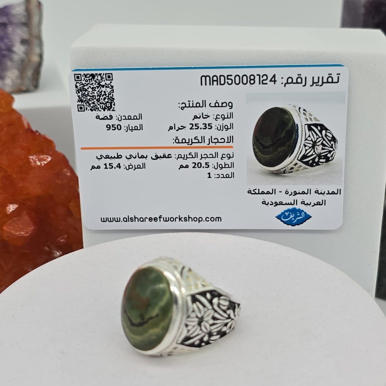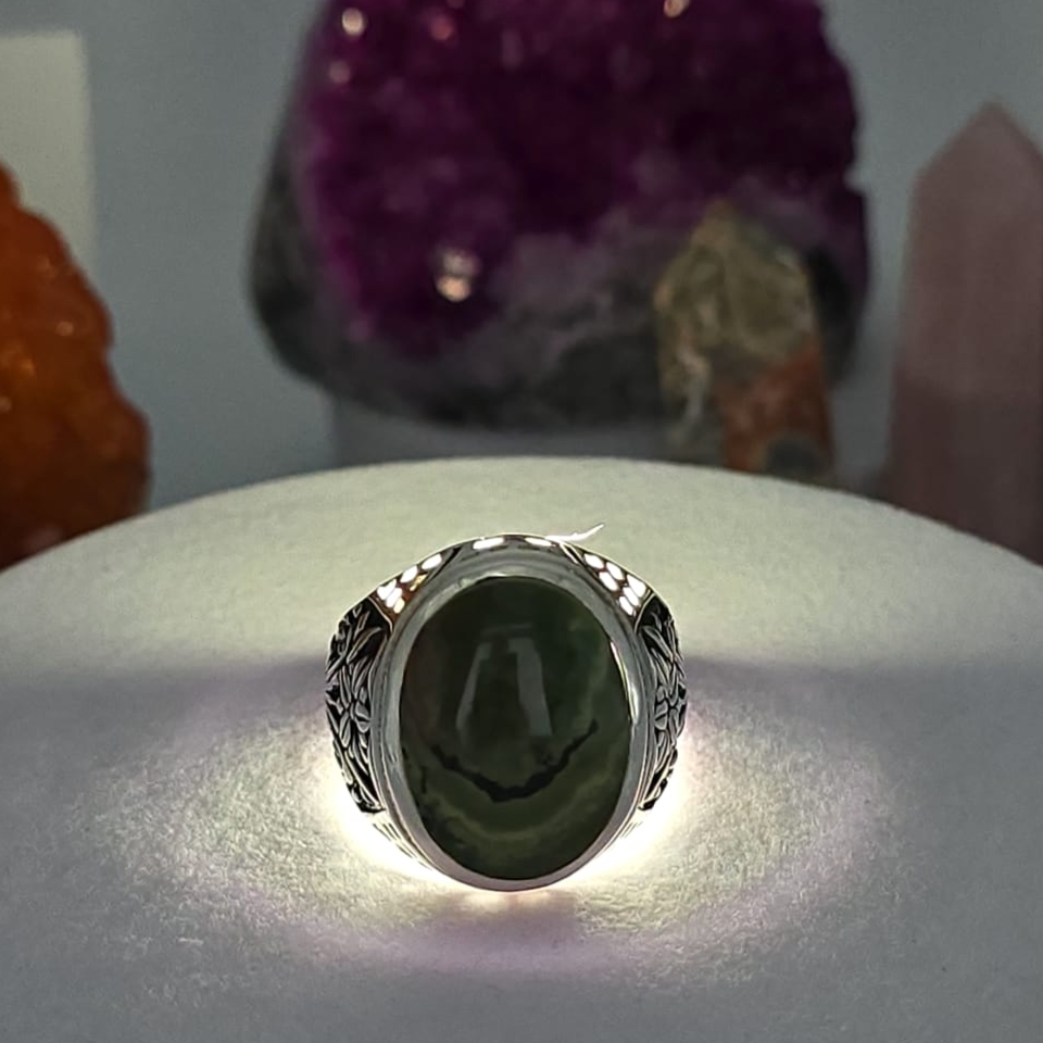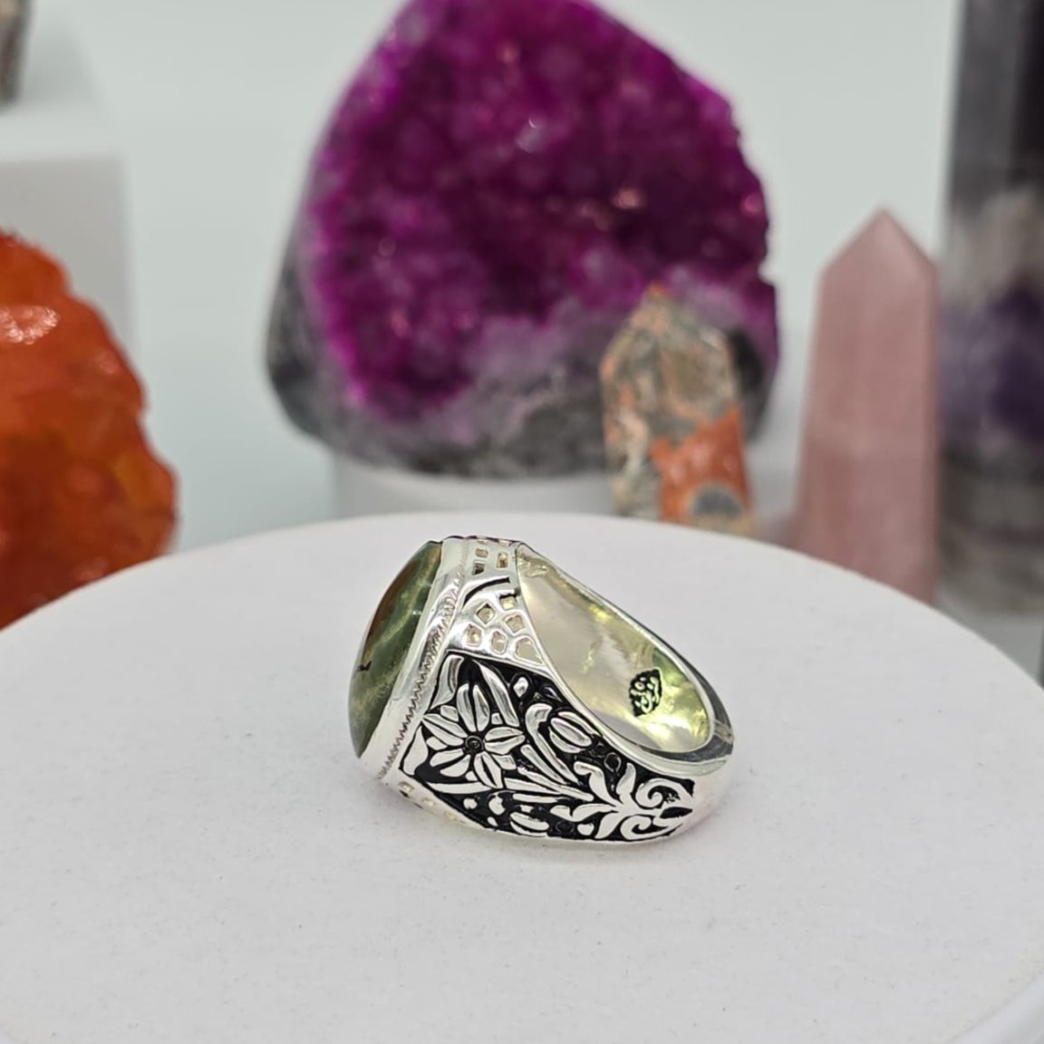 خاتم رجالي أنيق يتوسطه حجر الدم الطبيعي المصاغ على قاعدة من الفضة الخالصة عيار 950.