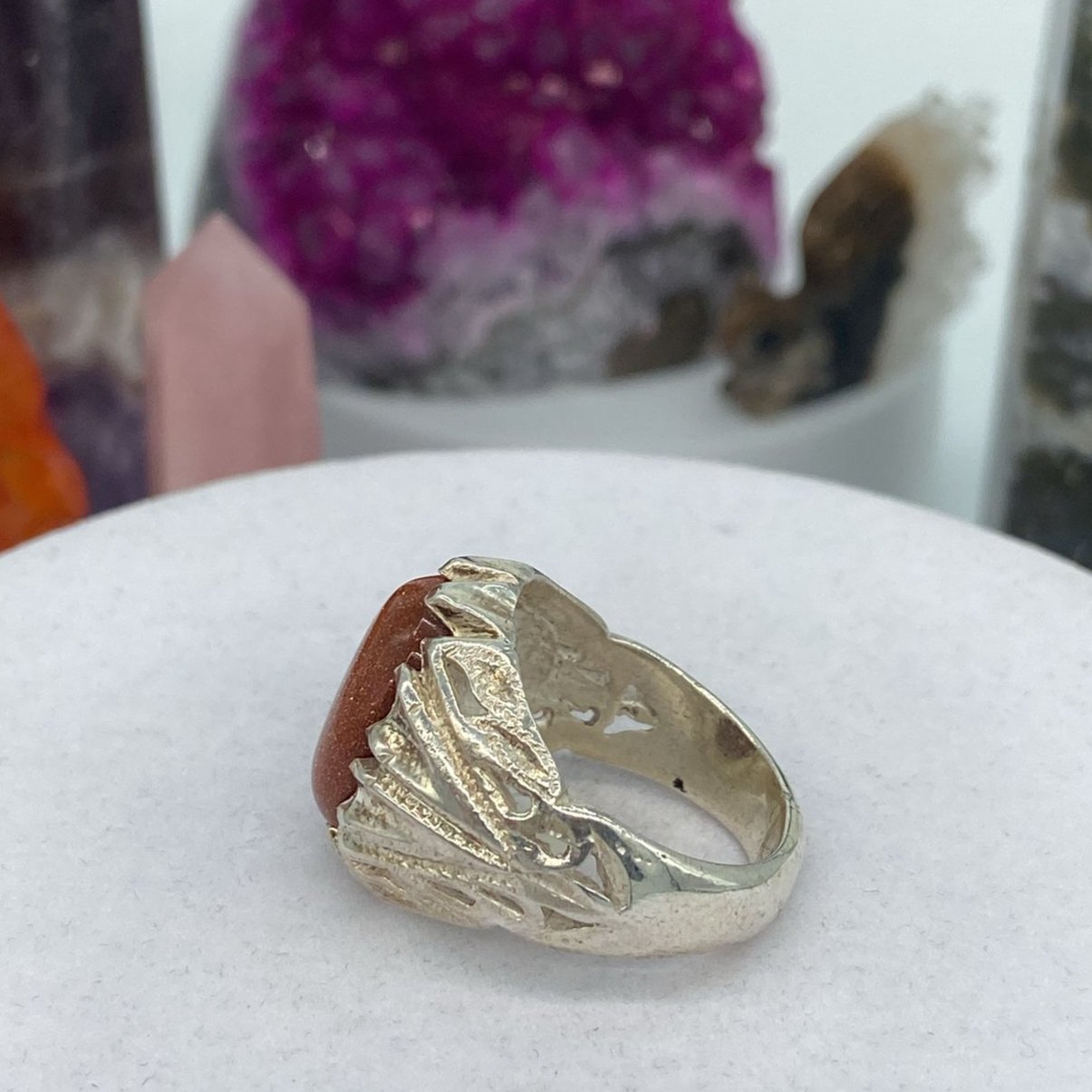 خاتم أنيق يتوسطه حجر النجوم الطبيعي المعروف بلمعانه البراق الذي يُشبه السماء المتلألئة بالنجوم، مصاغ على قاعدة من فضة عيار 950 بتصميم شرقي راقٍ يُبرز جمال الحجر وسحره. قطعة مميزة تضيف حضورًا متفردًا وتناسب الإطلالة اليومية والمناسبات الخاصة.