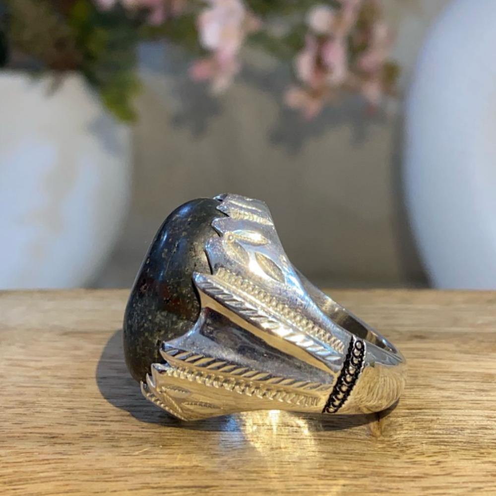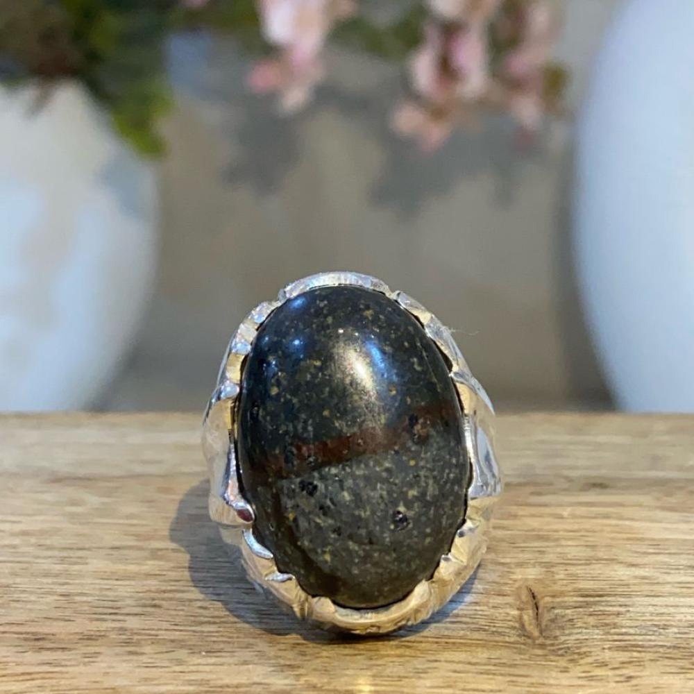 خاتم رجالي فخم يتوسطه حجر حديد بالي طبيعي يتميز بصلابته ولمعانه المعدني الفريد، مصاغ على قاعدة من فضة خالصة عيار 950.