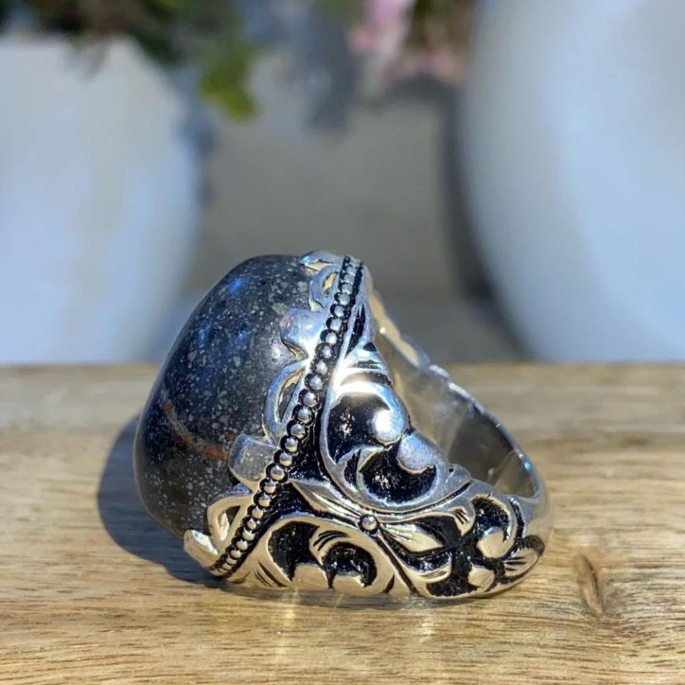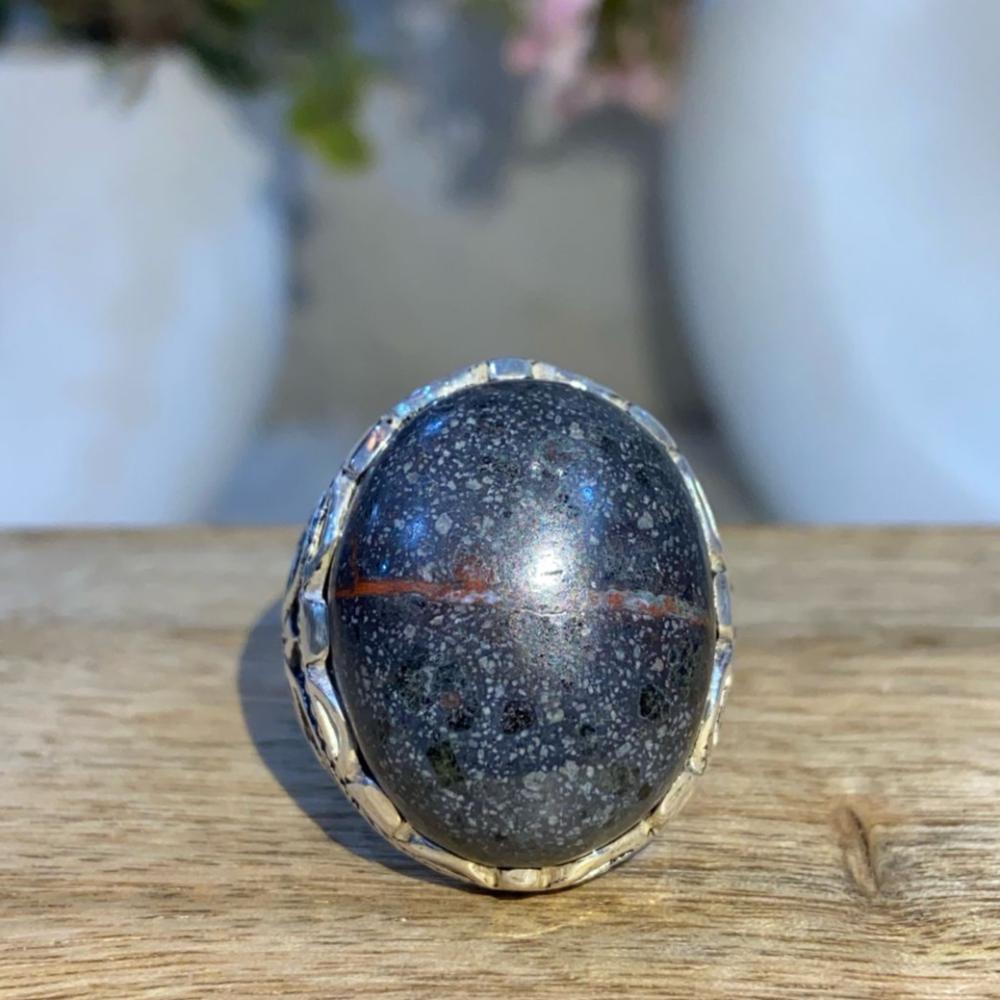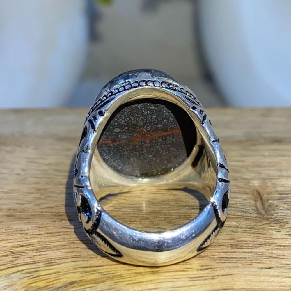خاتم رجالي فخم يتوسطه حجر حديد بالي طبيعي يتميز بصلابته ولمعانه المعدني الفريد، مصاغ على قاعدة من فضة خالصة عيار 950.
