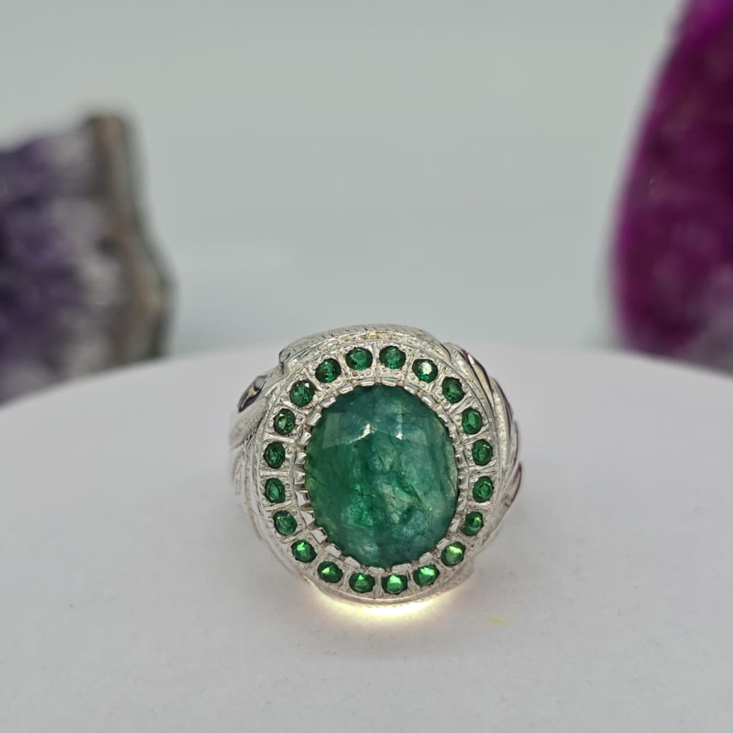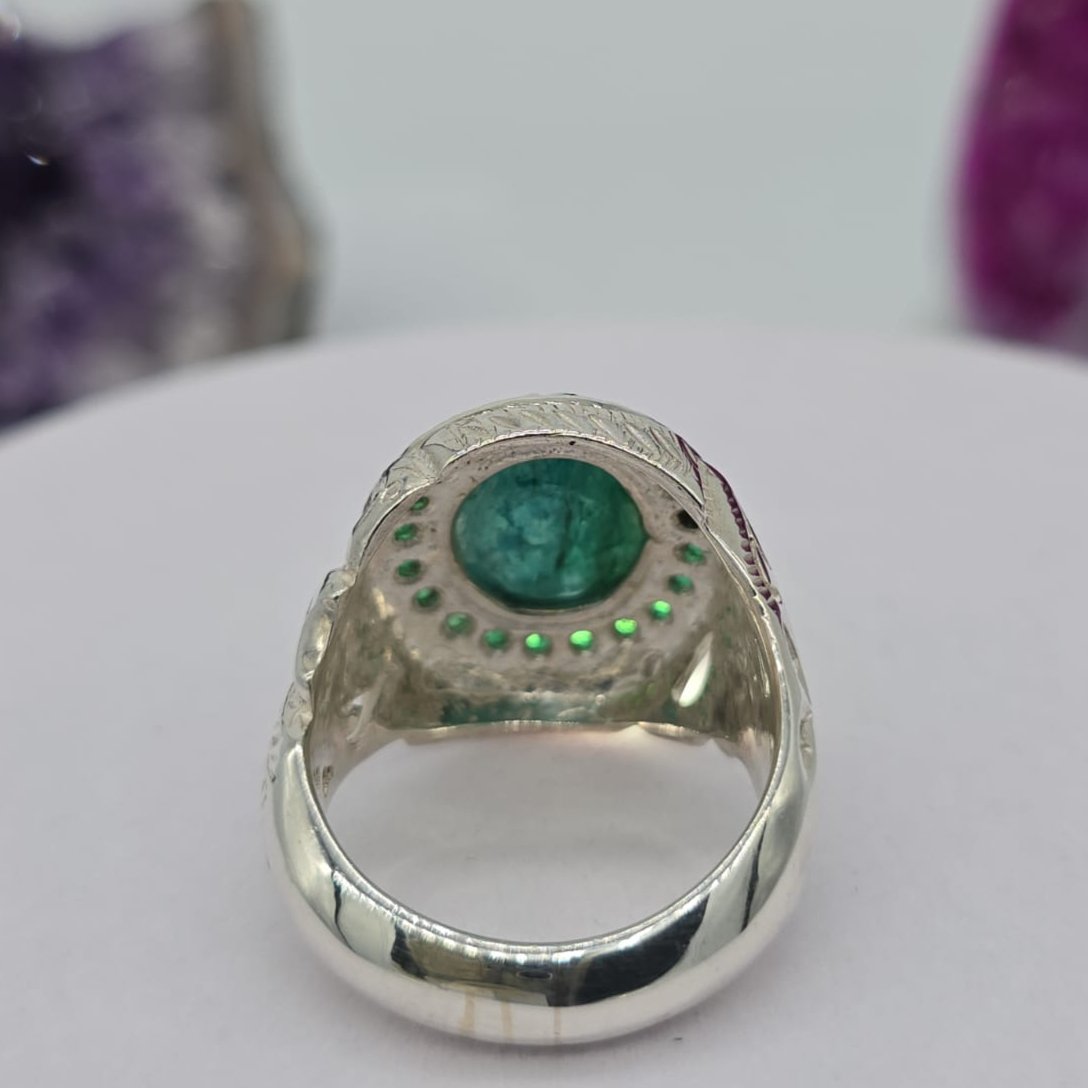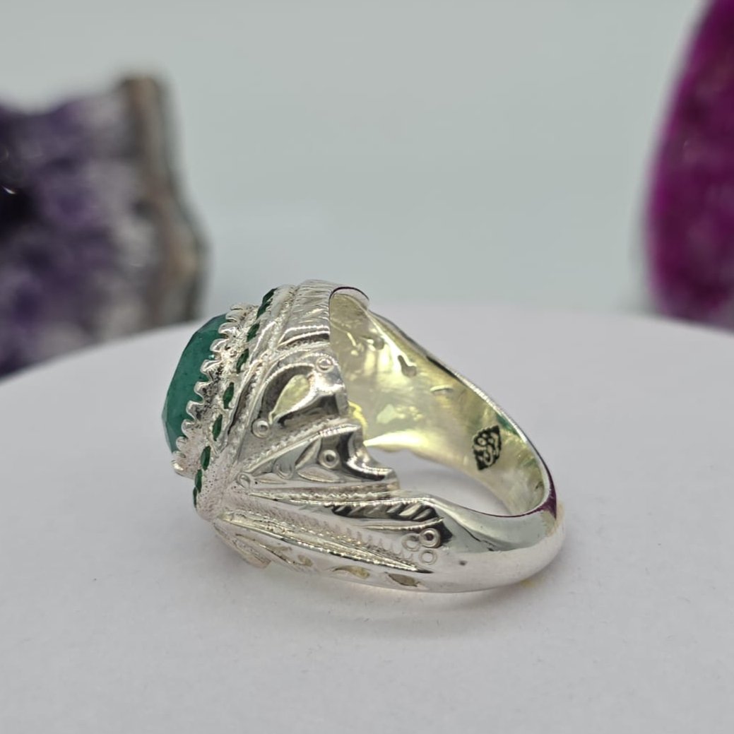 شغل يدوي خاتم رجالي زمرد بلونه الأخضر العميق الذي يرمز للنقاء و الحيوية. مصاغ من فضة نقية بتصميم شرقي أنيق يبرز فخامة الحجر و جماله الطبيعي بتفاصيل متقنة تعكس الذوق الرفيع.