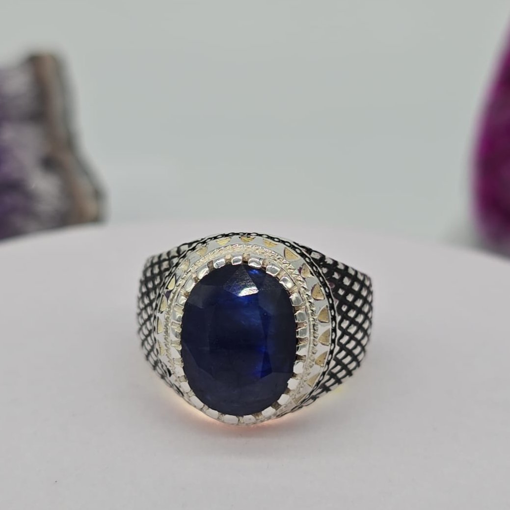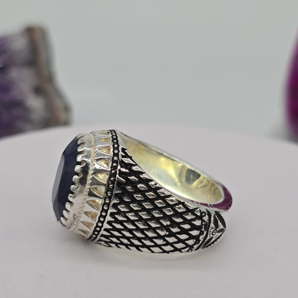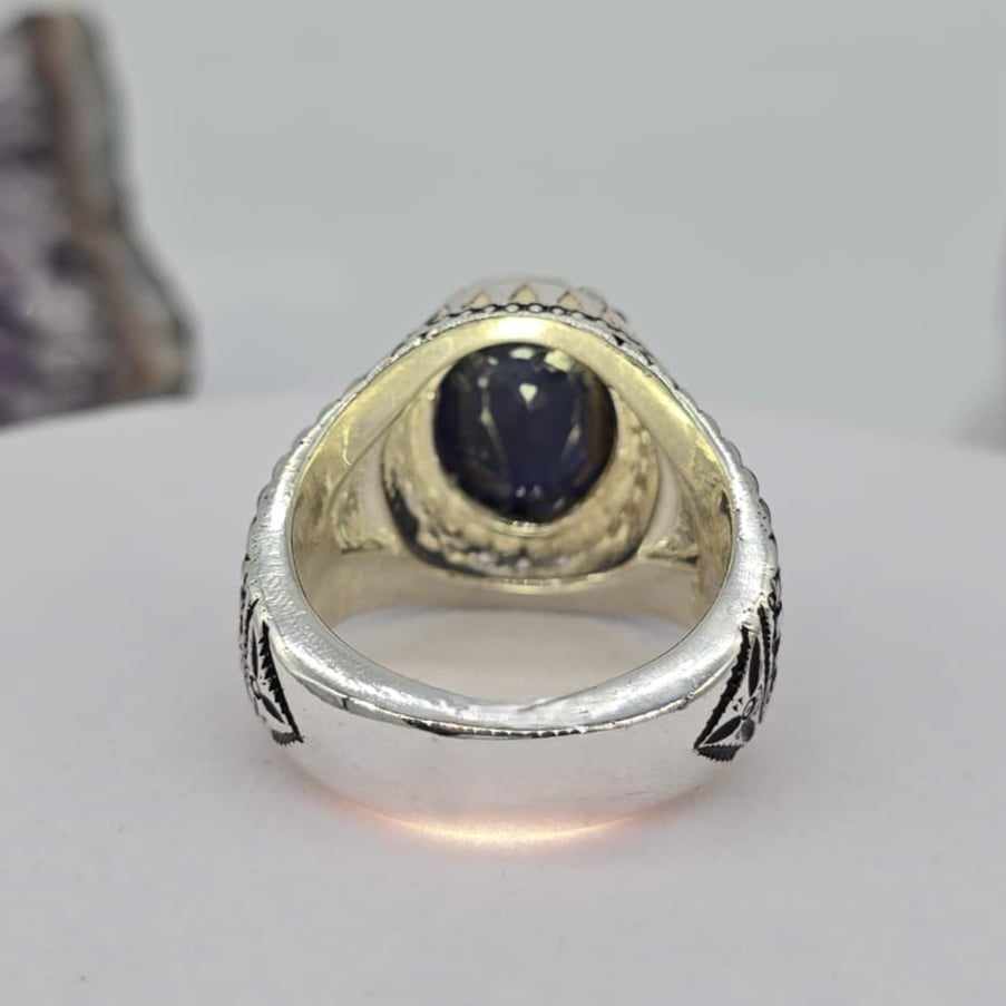 خاتم رجالي أنيق يتوسطه حجر زفير أفريقي طبيعي بلونه الازرق العميق الساحر الذي يرمز للحكمة والقوة.