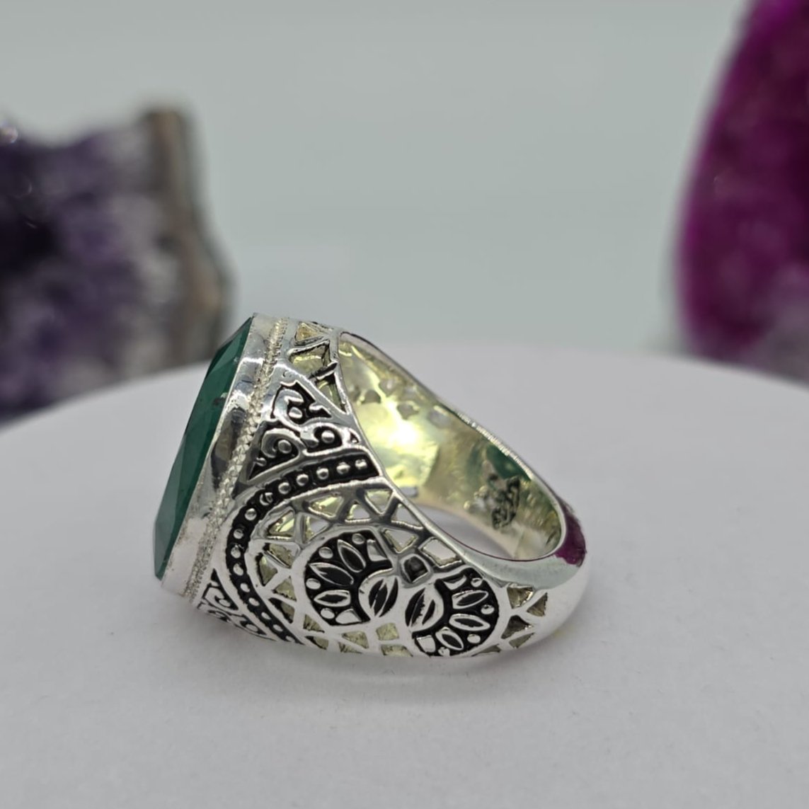 خاتم رجالي فاخر يتوسطه حجر زمرد طبيعي بلونه الأخضر العميق الذي يرمز للنقاء والتجدد.