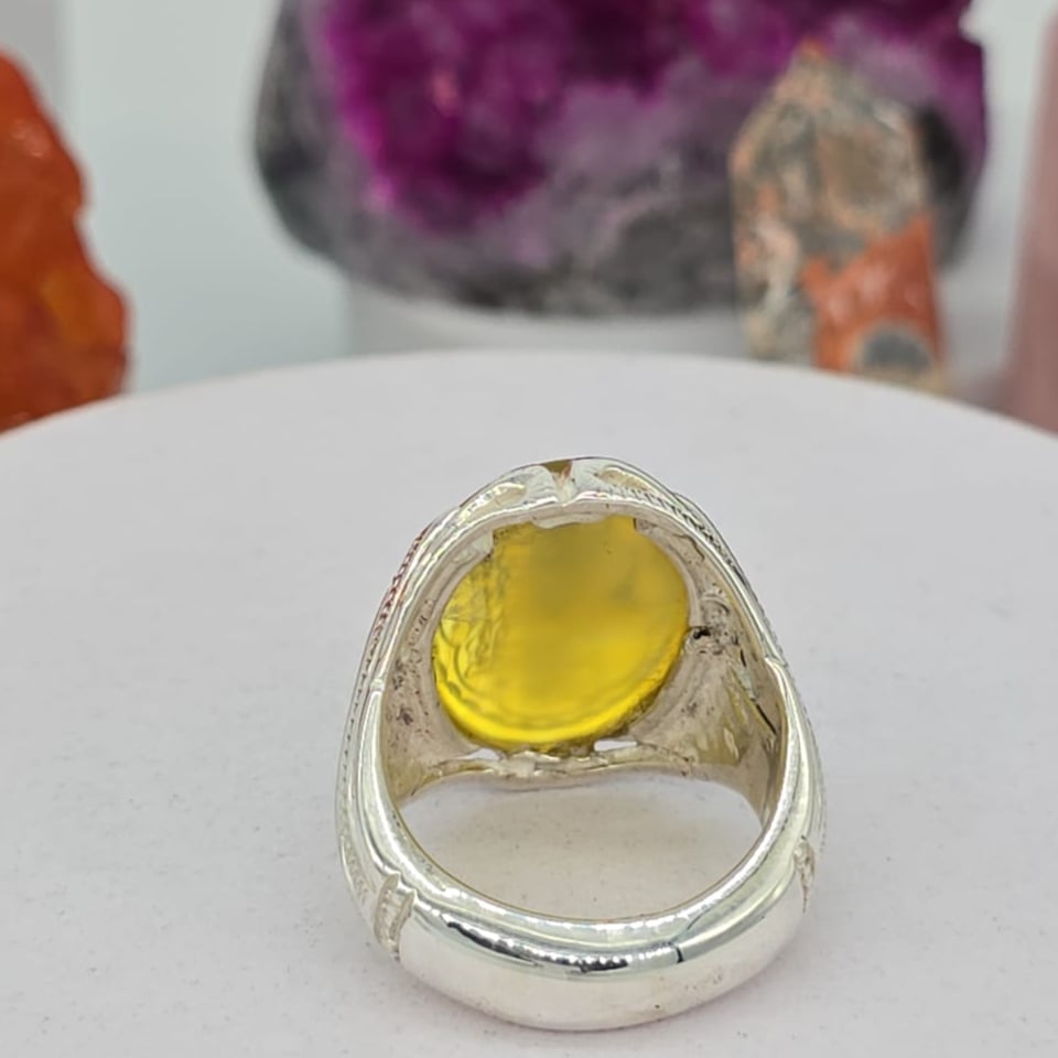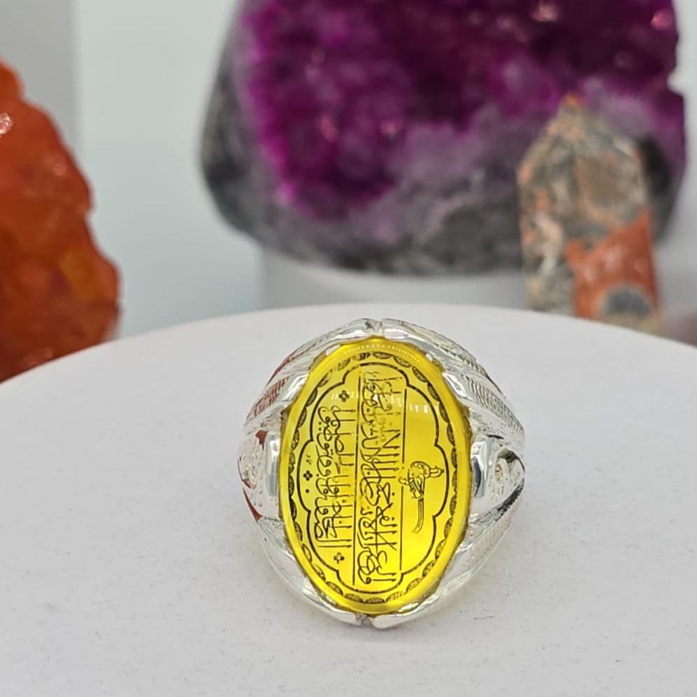 خاتم رجالي فاخر يتوسطه حجر عقيق شرف الشمس الطبيعي المميز بلونه الأصفر الذهبي الدافئ، وقد نُقشت على سطح الحجر آيات من سورة العصر بخط يدوي دقيق، ليحمل بعدًا روحانيًا ومعنويًا عميقًا.