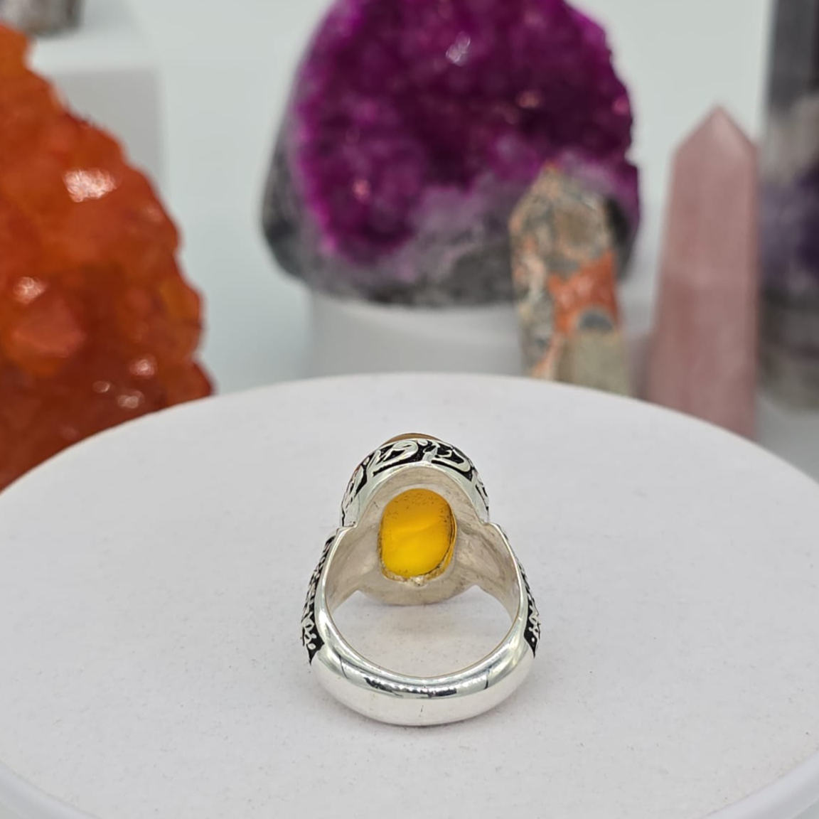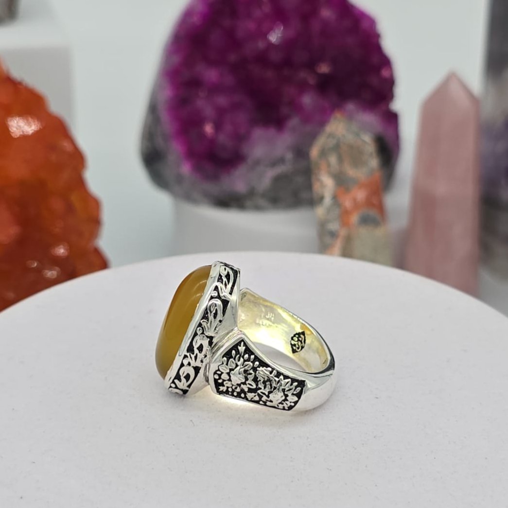 خاتم رجالي فاخر يتوسطه حجر عقيق شرف الشمس الطبيعي المميز بلونه الأصفر الذهبي الدافئ،