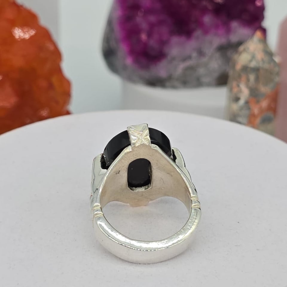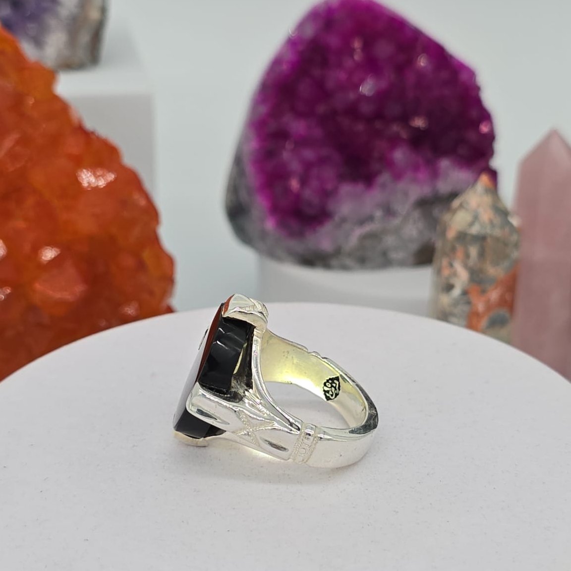 خاتم رجالي فاخر يتوسطه حجر عقيق أفريقي أسود طبيعي بلونه الداكن الغني وتدرجاته المميزة، مصاغ على قاعدة من فضة عيار 950 بتصميم شرقي أنيق يناسب الرجل ذو الذوق الرفيع. قطعة فريدة تعكس الفخامة والقوة وتضفي لمسة مميزة على الإطلالة اليومية والمناسبات الخاصة.