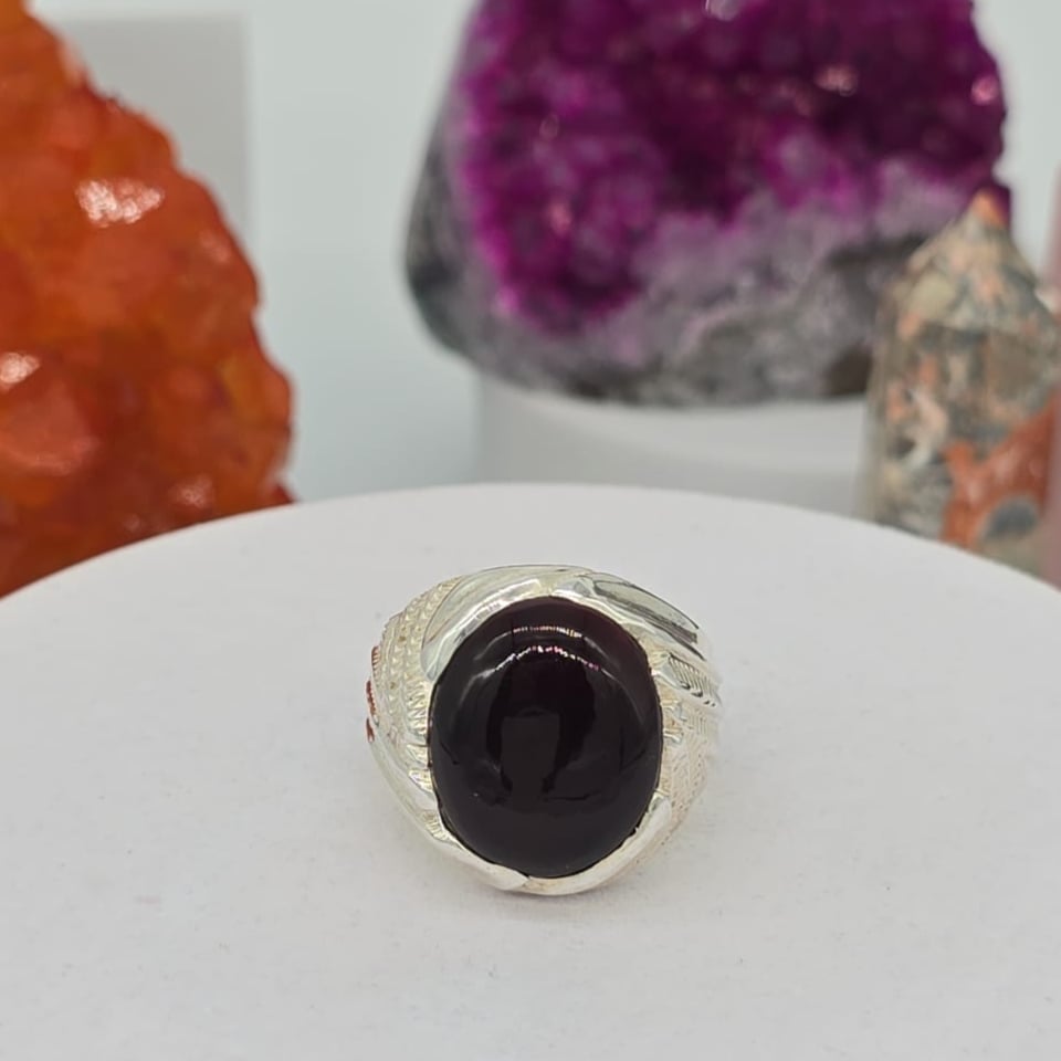 خاتم رجالي فاخر يتوسطه حجر عقيق أفريقي أسود طبيعي بلونه الداكن الغني وتدرجاته المميزة، مصاغ على قاعدة من فضة عيار 950 بتصميم شرقي أنيق يناسب الرجل ذو الذوق الرفيع. قطعة فريدة تعكس الفخامة والقوة وتضفي لمسة مميزة على الإطلالة اليومية والمناسبات الخاصة.