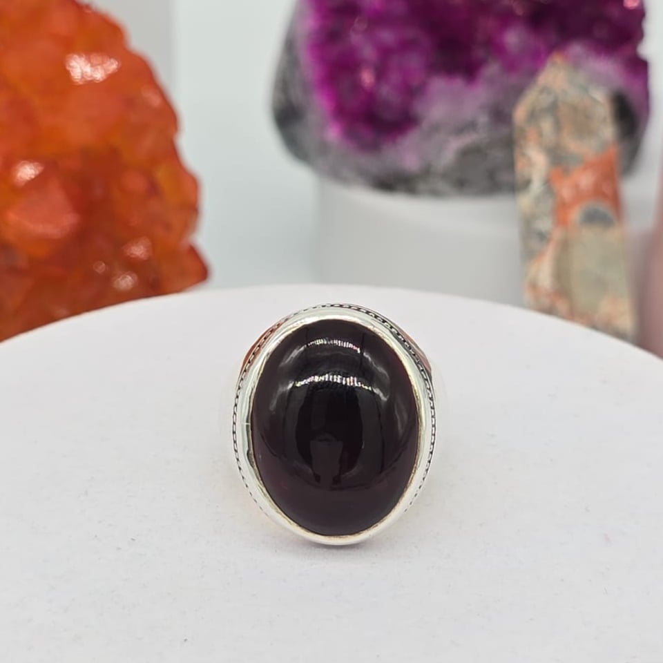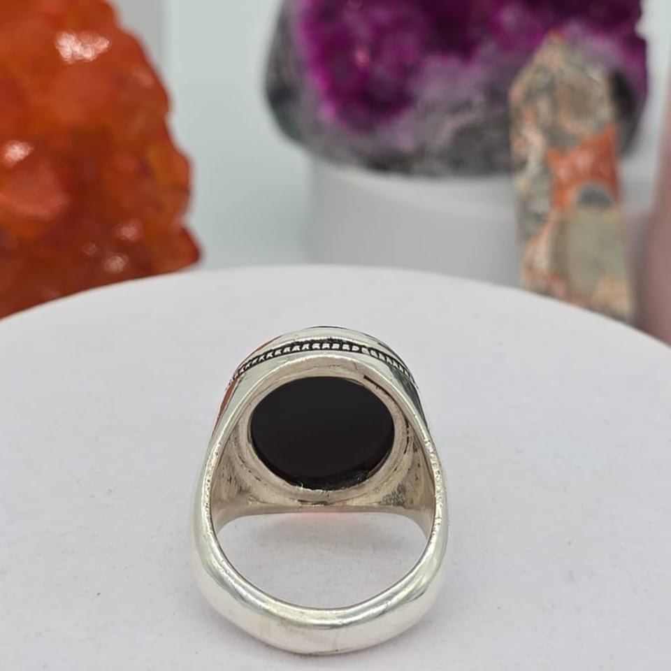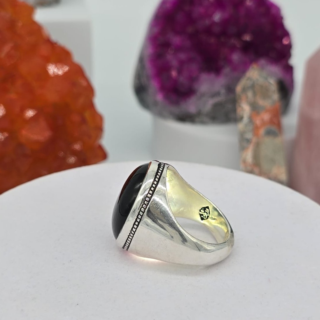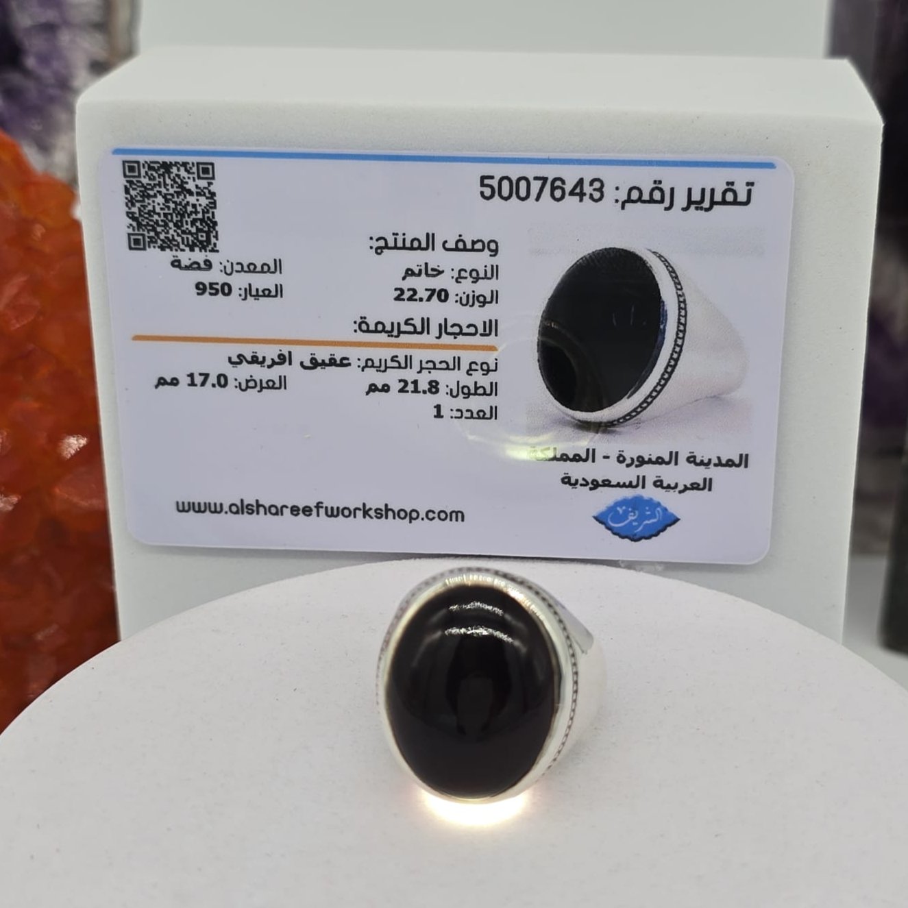 خاتم رجالي فاخر يتوسطه حجر عقيق أفريقي أسود طبيعي بلونه الداكن الغني وتدرجاته المميزة، مصاغ على قاعدة من فضة عيار 950 بتصميم شرقي أنيق يناسب الرجل ذو الذوق الرفيع. قطعة فريدة تعكس الفخامة والقوة وتضفي لمسة مميزة على الإطلالة اليومية والمناسبات الخاصة.