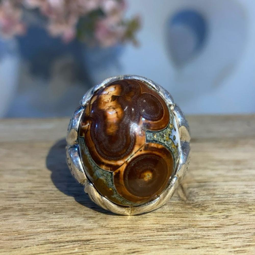 خاتم رجالي فاخر يتوسطه حجر عقيق داوودي طبيعي يتميز برسومات دائرية متناسقة تُشبه العين، مما يمنحه طابعًا نادرًا وفريدًا.