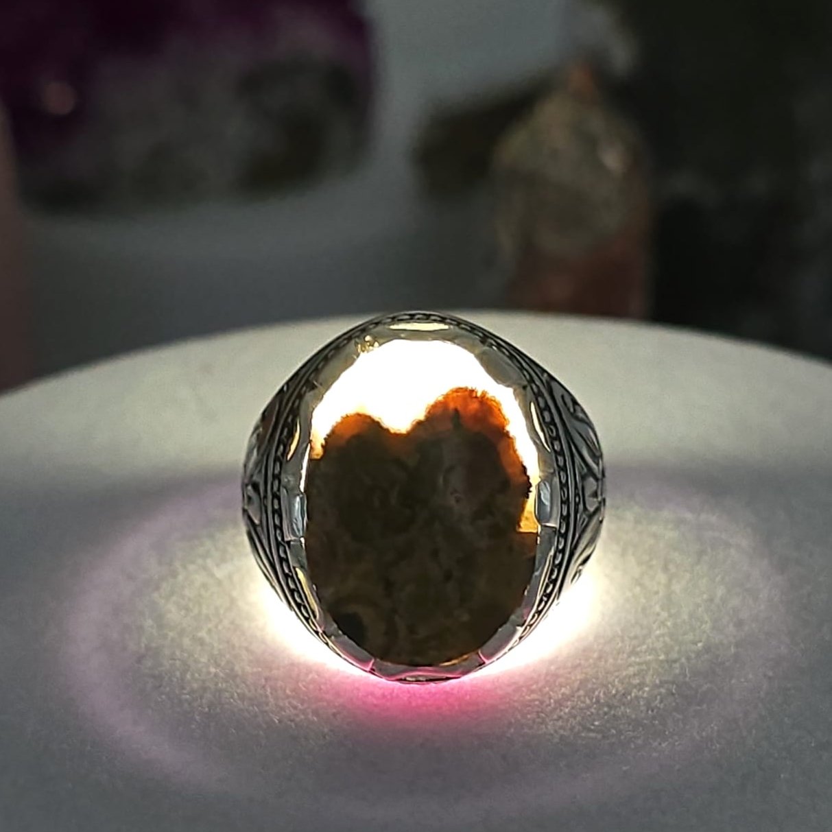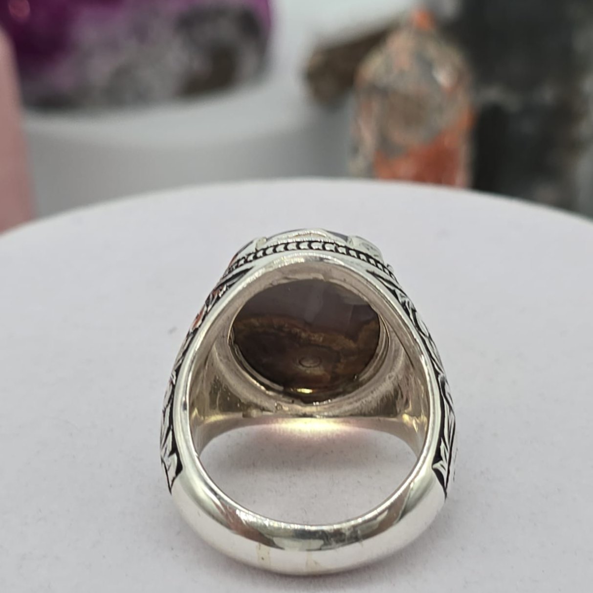 خاتم رجالي فاخر يتوسطه حجر عقيق داوودي طبيعي يتميز برسومات دائرية متناسقة تُشبه العين، مما يمنحه طابعًا نادرًا وفريدًا.