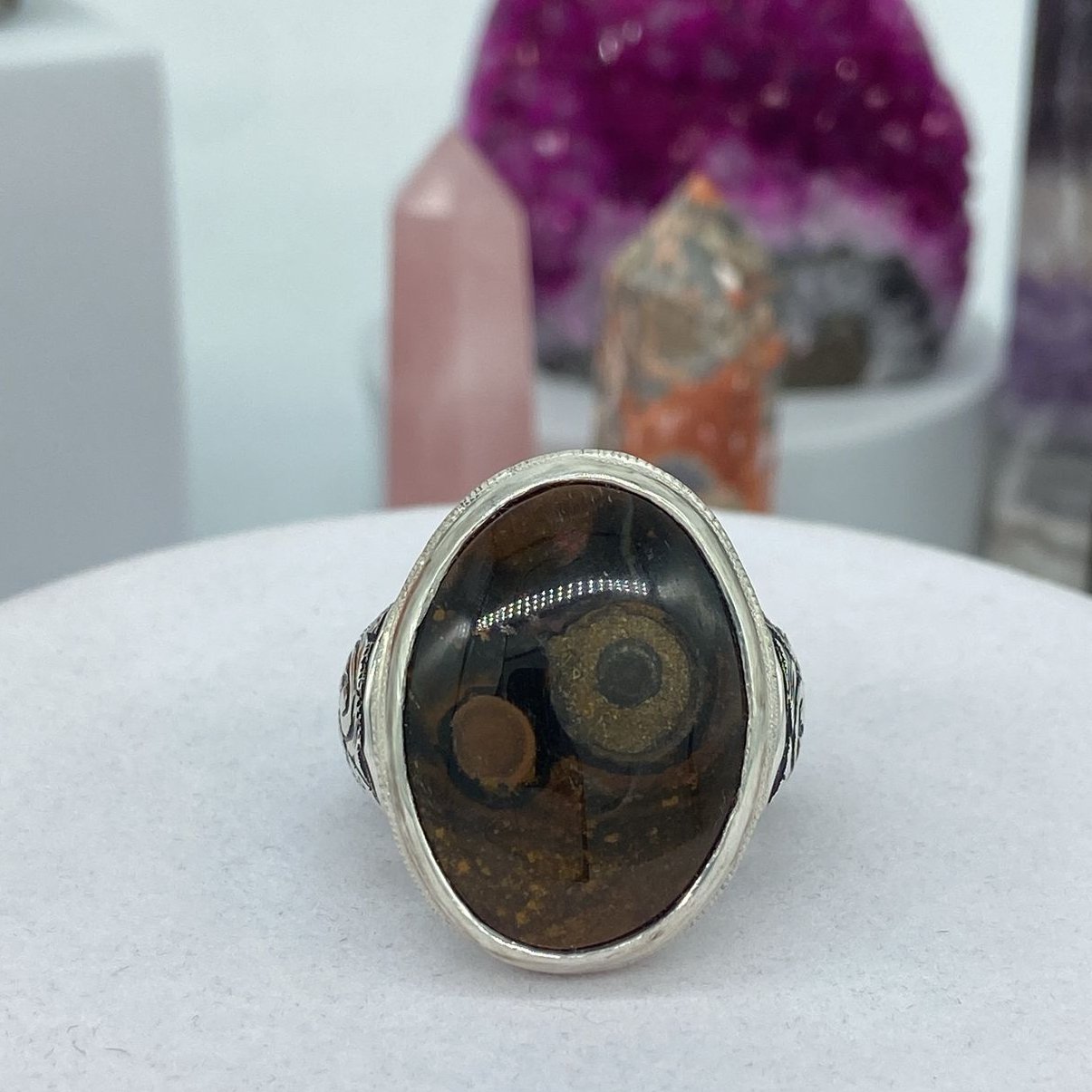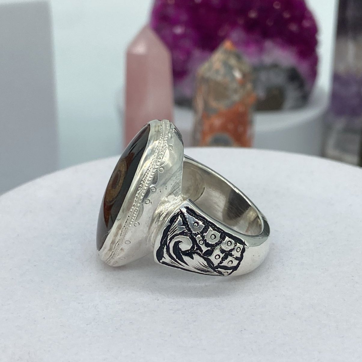 خاتم رجالي فاخر يتوسطه حجر عقيق داوودي طبيعي يتميز برسومات دائرية متناسقة تُشبه العين، مما يمنحه طابعًا نادرًا وفريدًا.