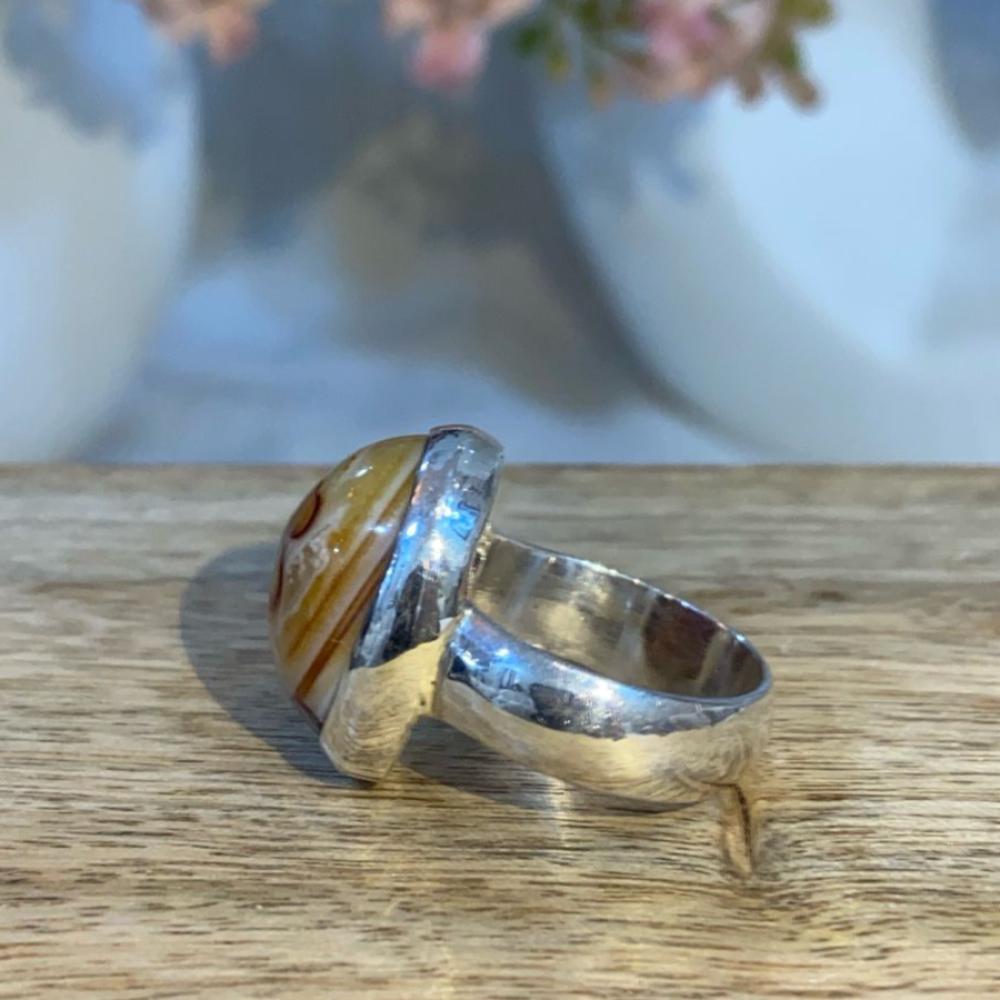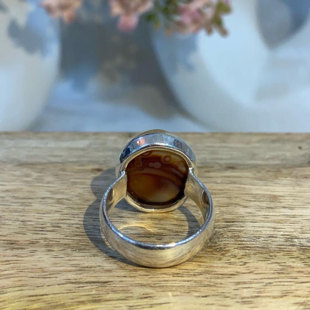 خاتم رجالي مميز يتوسطه حجر عقيق داوودي طبيعي، يتميز بألوانه المتداخلة وخطوطه العريقة التي تمنح كل حجر طابعًا فريدًا لا يتكرر.