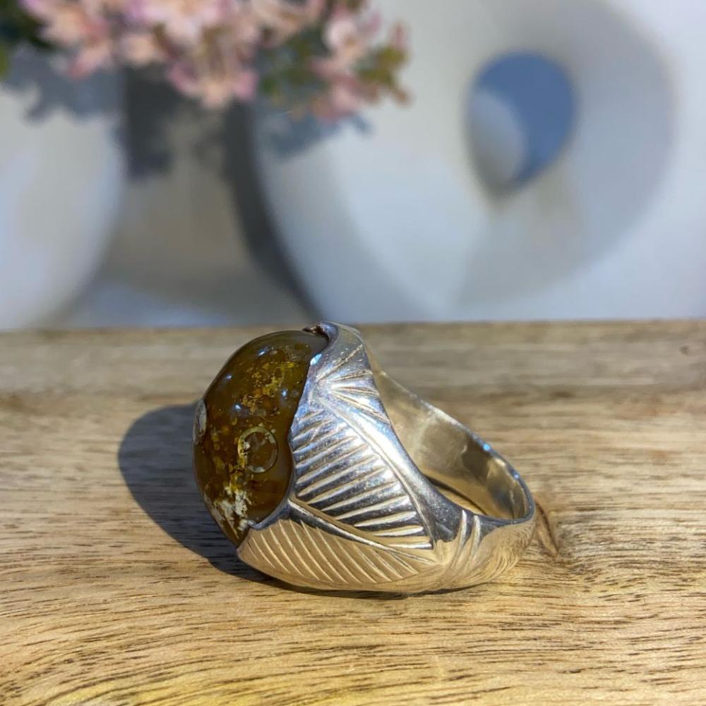 خاتم رجالي مميز يتوسطه حجر عقيق سليماني هندي طبيعي، يتميز بألوانه المتداخلة وخطوطه العريقة التي تمنح كل حجر طابعًا فريدًا لا يتكرر.