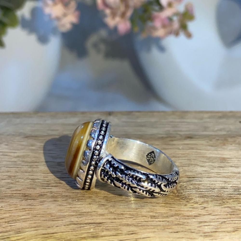 خاتم رجالي مميز يتوسطه حجر عقيق سليماني هندي طبيعي، يتميز بألوانه المتداخلة وخطوطه العريقة التي تمنح كل حجر طابعًا فريدًا لا يتكرر.