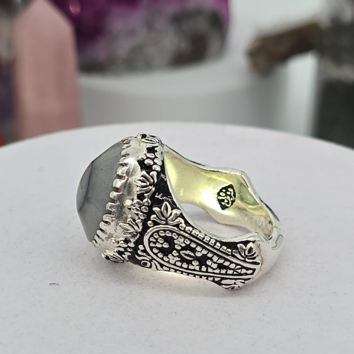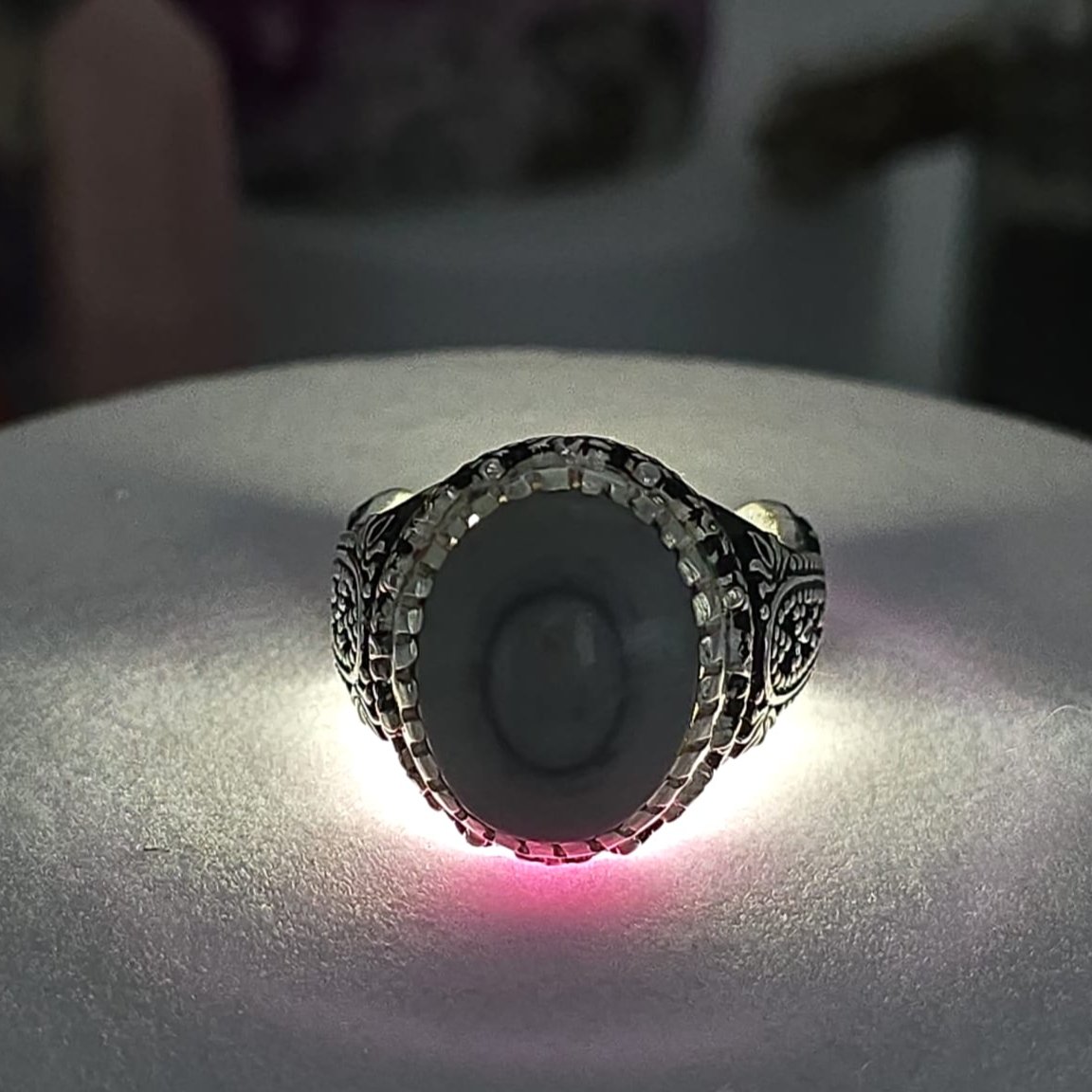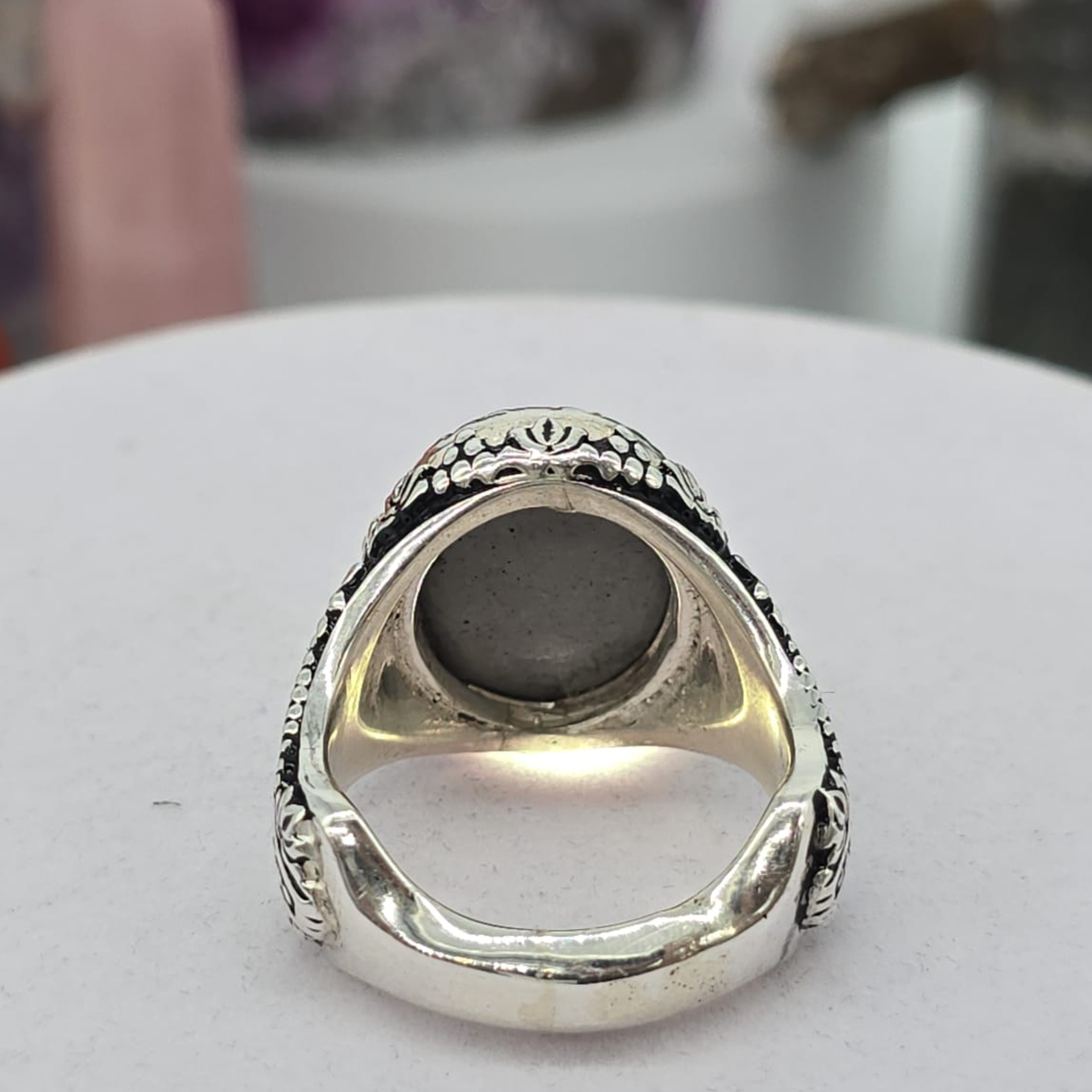 مصاغ بعناية على قاعدة من فضة عيار 950 بتصميم شرقي فاخر يُبرز جاذبية الحجر ويُضفي حضورًا قويًا وأناقة خاصة.