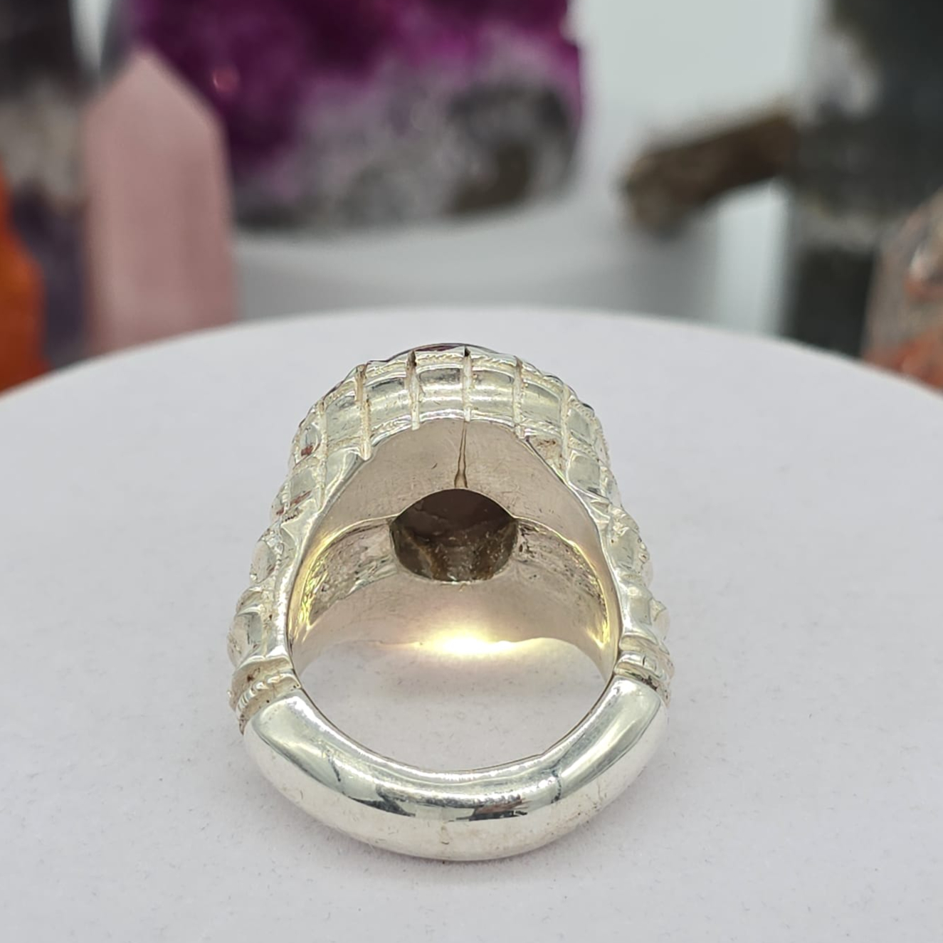 مصاغ بعناية على قاعدة من فضة عيار 950 بتصميم شرقي فاخر يُبرز جاذبية الحجر ويُضفي حضورًا قويًا وأناقة خاصة.