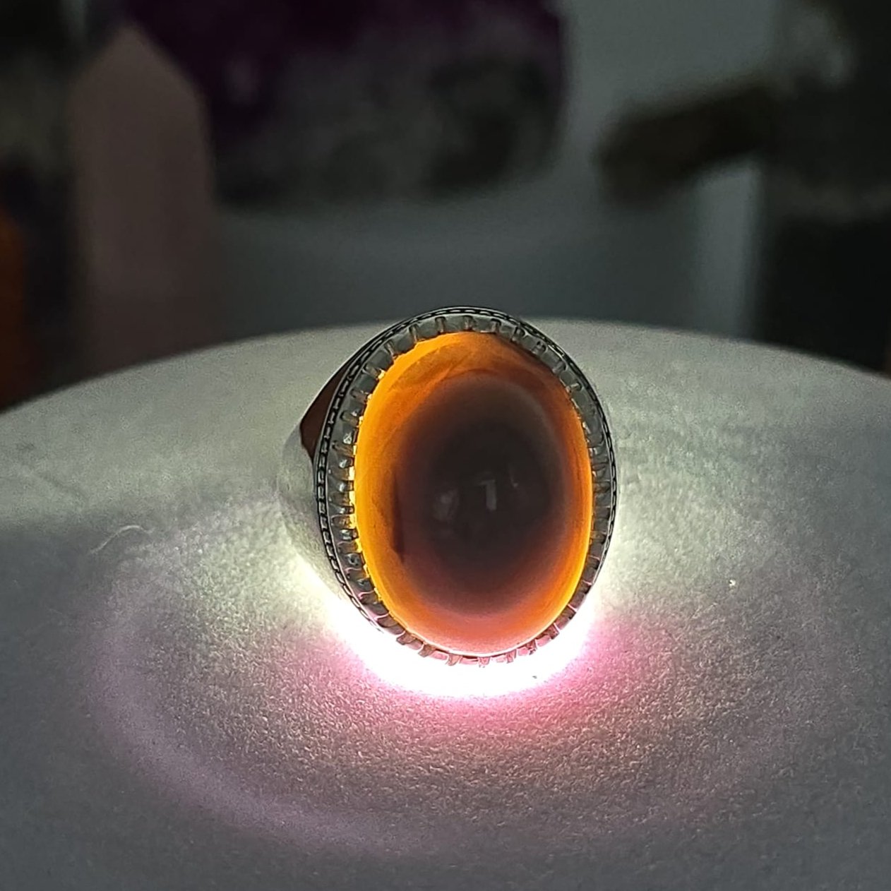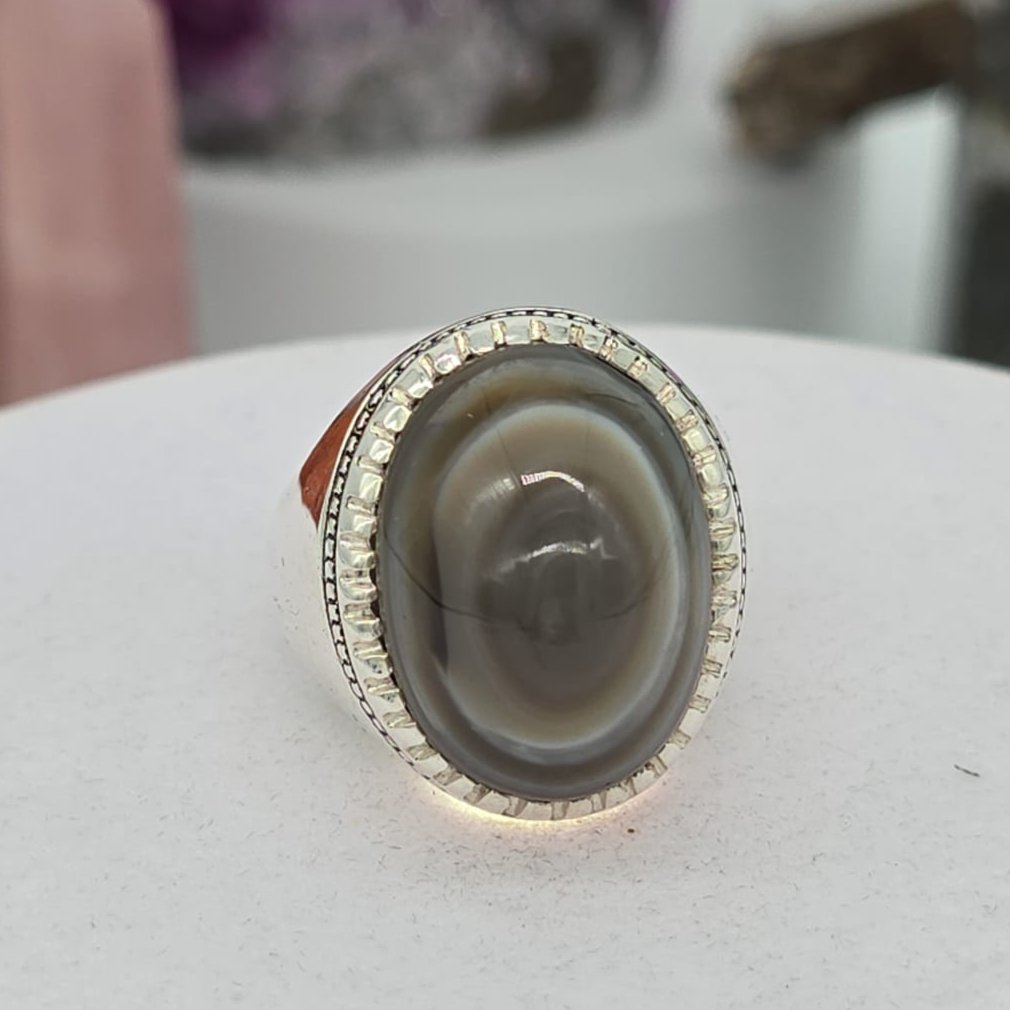مصاغ بعناية على قاعدة من فضة عيار 950 بتصميم شرقي فاخر يُبرز جاذبية الحجر ويُضفي حضورًا قويًا وأناقة خاصة.
