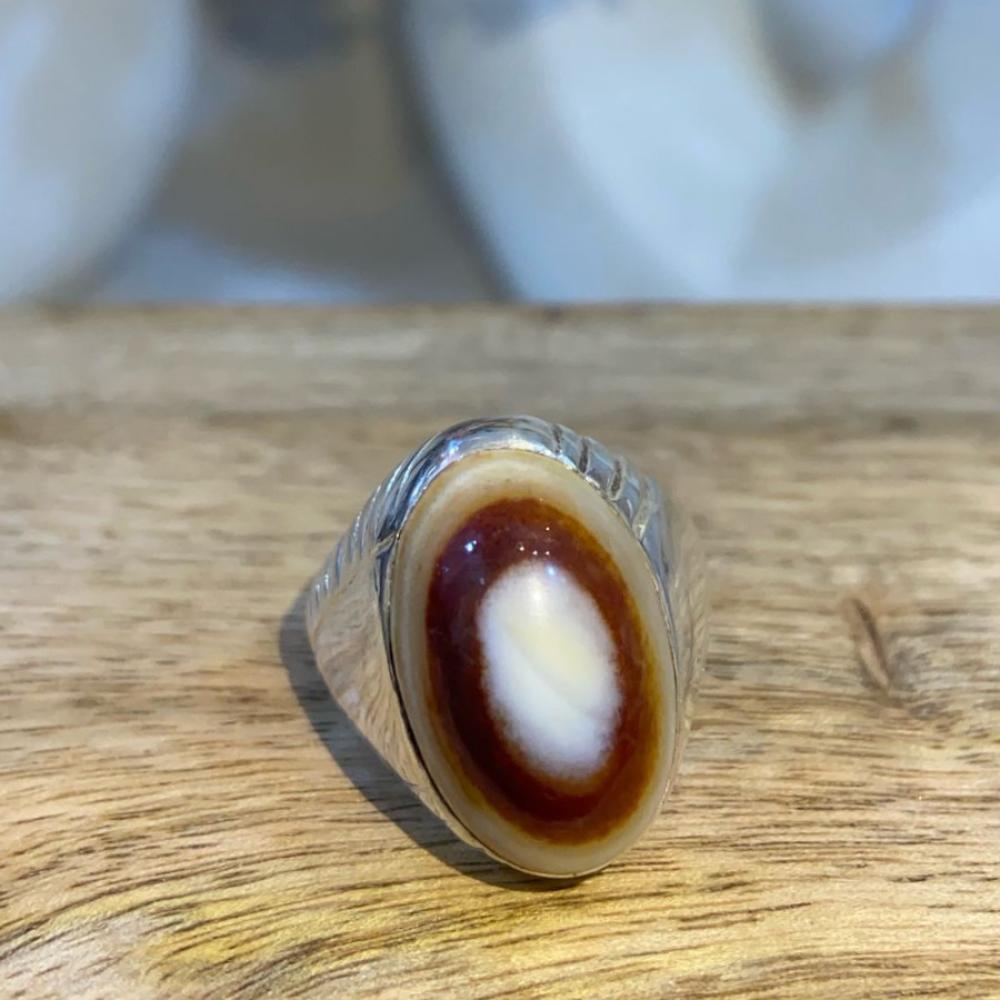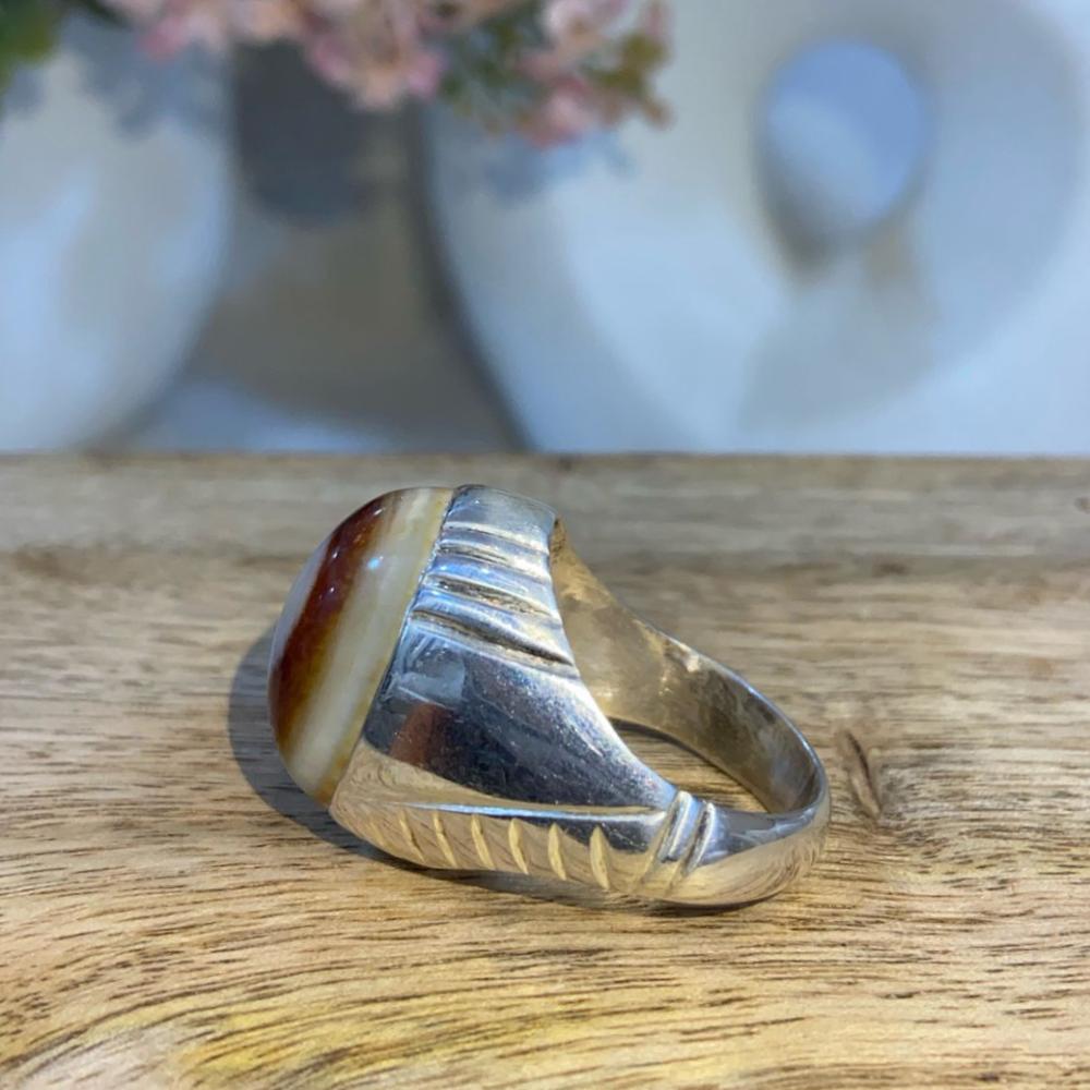 خاتم رجالي مميز يتوسطه حجر عقيق سليماني هندي طبيعي، يتميز بألوانه المتداخلة وخطوطه العريقة التي تمنح كل حجر طابعًا فريدًا لا يتكرر.
