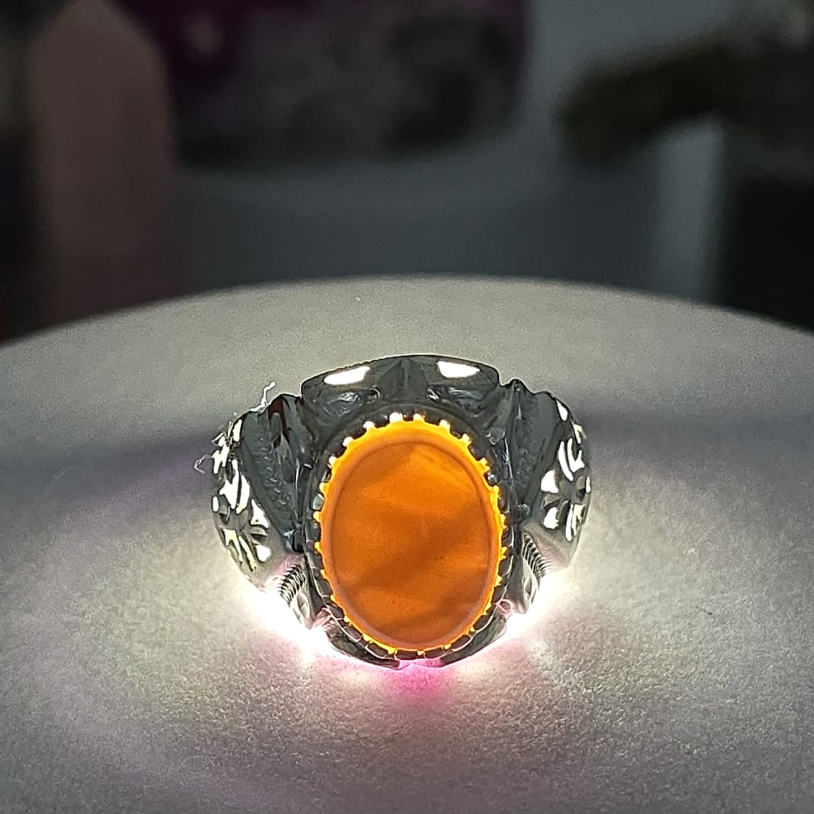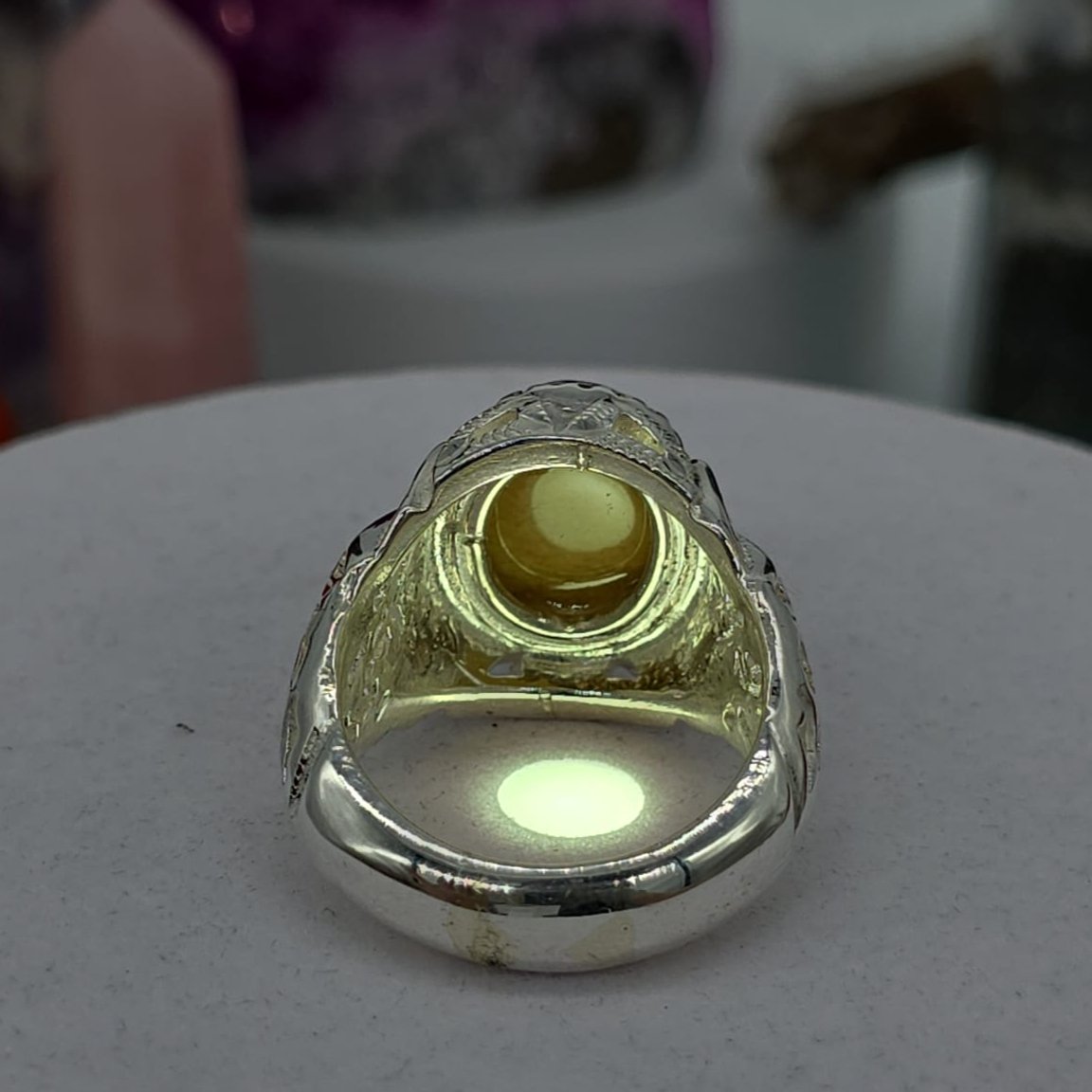 مصاغ بعناية على قاعدة من فضة عيار 950 بتصميم شرقي فاخر يُبرز جاذبية الحجر ويُضفي حضورًا قويًا وأناقة خاصة.