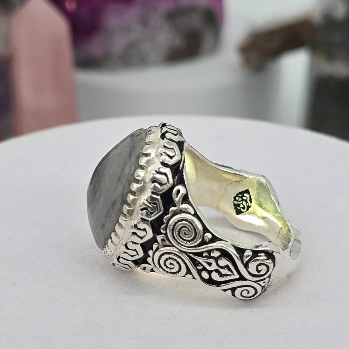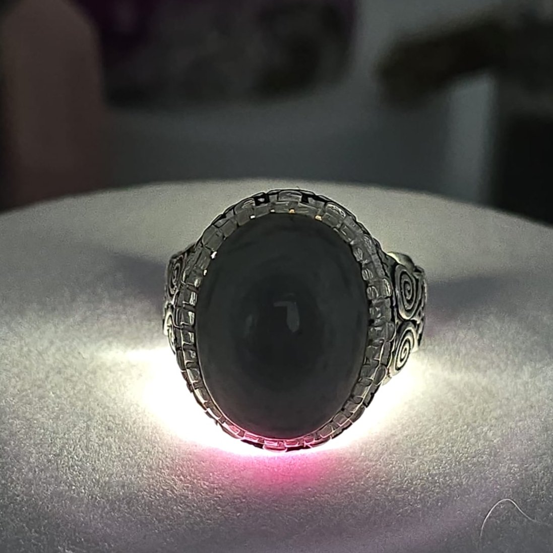 مصاغ بعناية على قاعدة من فضة عيار 950 بتصميم شرقي فاخر يُبرز جاذبية الحجر ويُضفي حضورًا قويًا وأناقة خاصة.