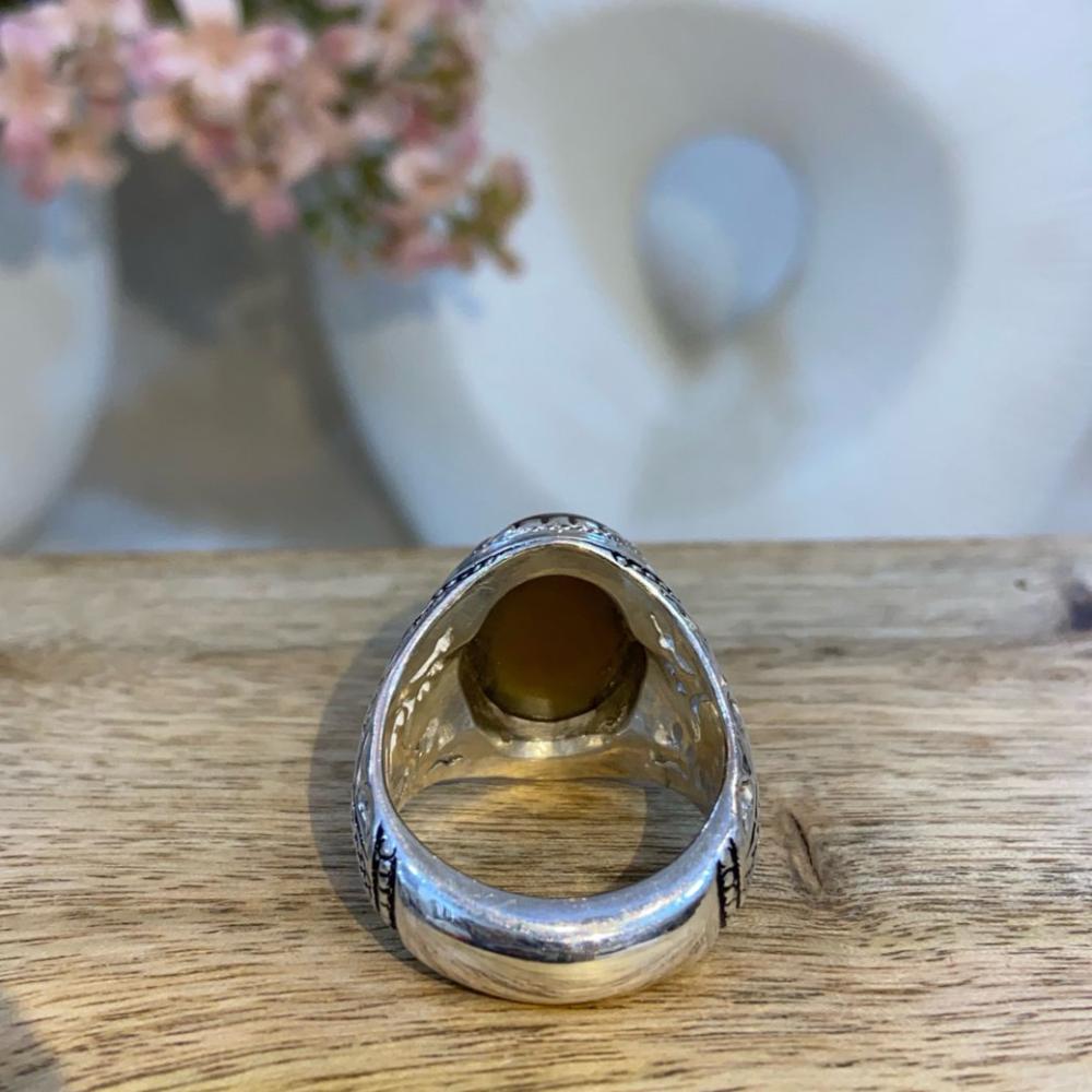 مصاغ بعناية على قاعدة من فضة عيار 950 بتصميم شرقي فاخر يُبرز جاذبية الحجر ويُضفي حضورًا قويًا وأناقة خاصة.