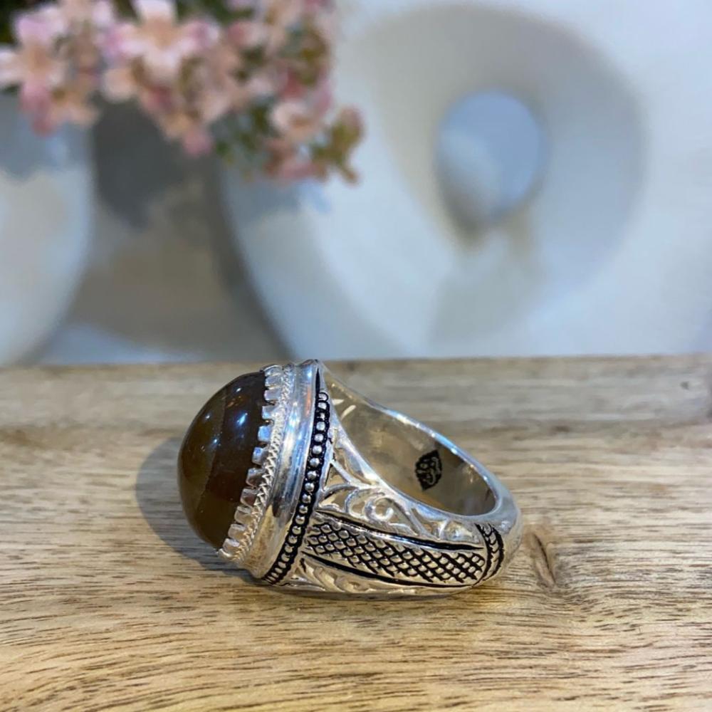 خاتم رجالي مميز يتوسطه حجر عقيق سليماني هندي طبيعي، يتميز بألوانه المتداخلة وخطوطه العريقة التي تمنح كل حجر طابعًا فريدًا لا يتكرر.