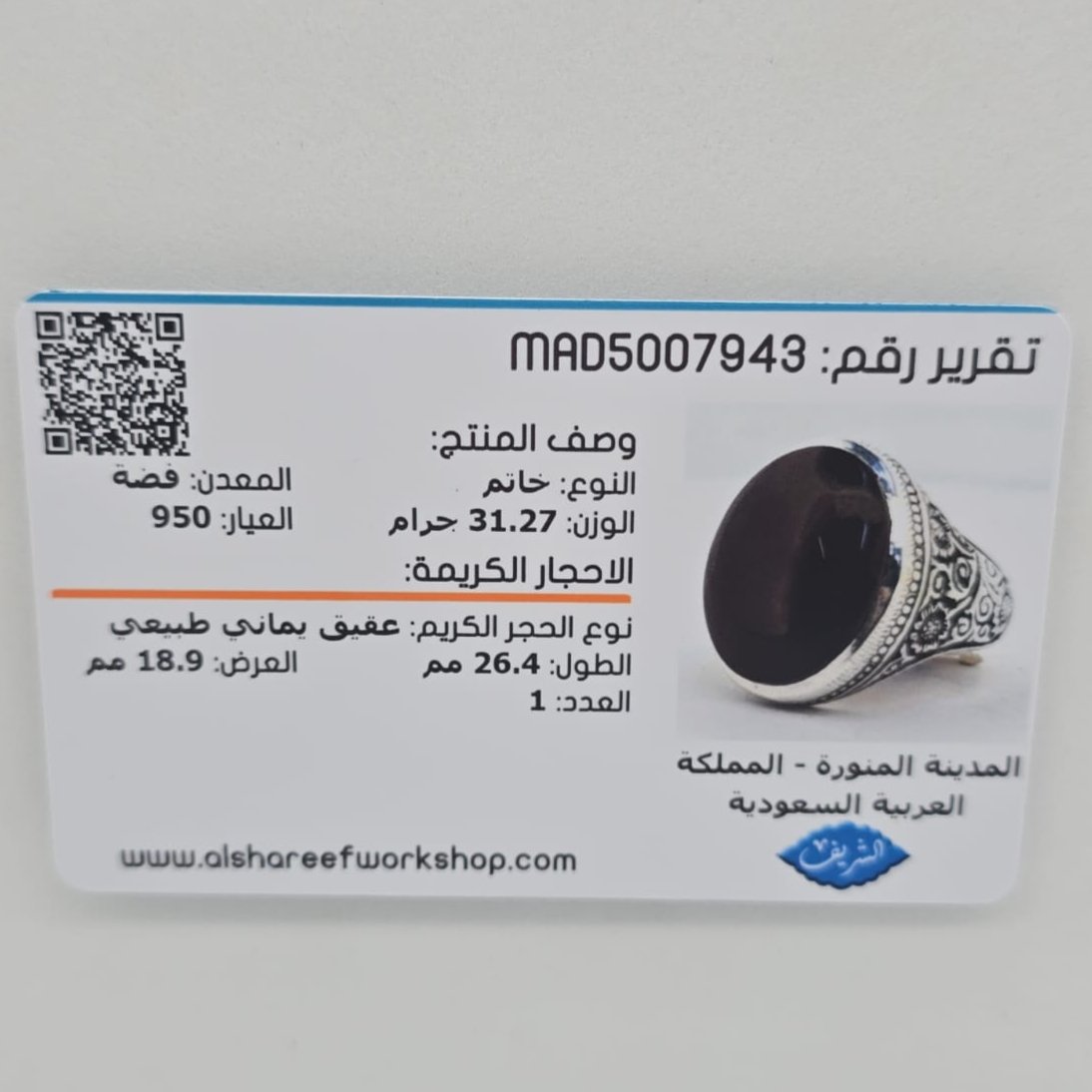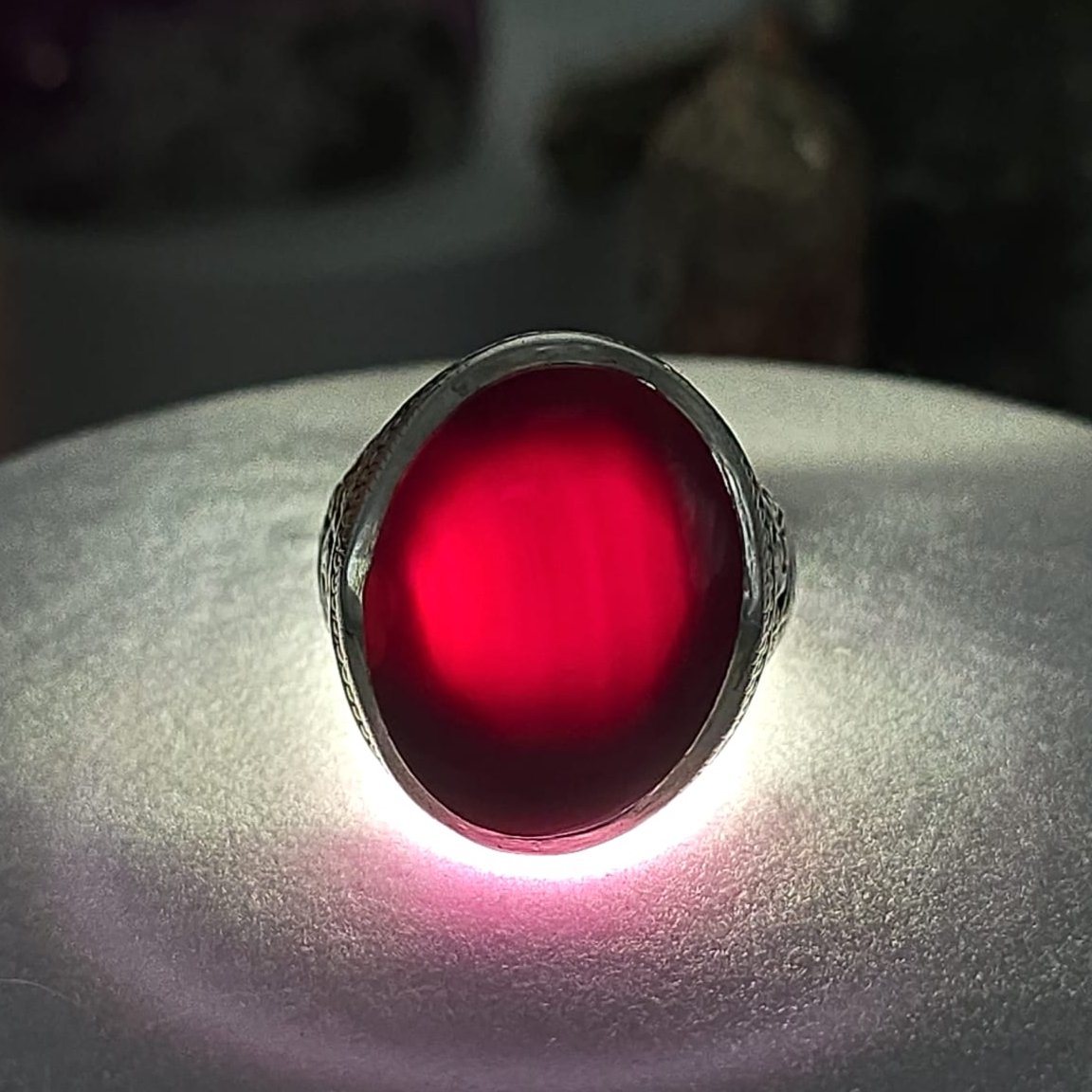 خاتم رجالي فاخر يتوسطه حجر عقيق كبدي طبيعي بلونه الغني والمميز، وتكتمل روعة القطعة بنقش غزال على الصياغة، مصاغ على قاعدة من فضة عيار 950 بتصميم شرقي أنيق يناسب الرجل ذو الذوق الرفيع. قطعة فريدة تعكس التفرد والفخامة وتضفي لمسة حيوية وحضورًا مميزًا على الإطلالة اليومية والمناسبات الخاصة.