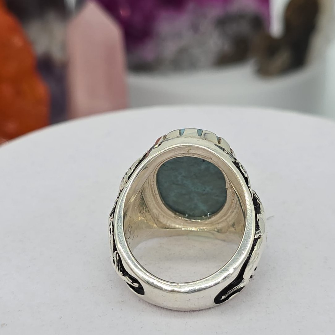 خاتم رجالي فريد مُرصع بحجر العقيق الكيوي الطبيعي المميز بألوانه الهادئة ونقاطه العشوائية التي تمنحه طابعًا خاصًا.