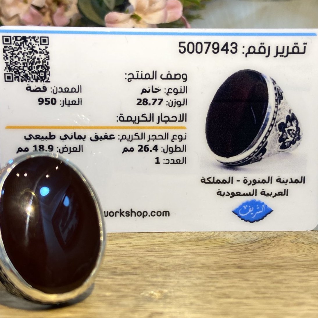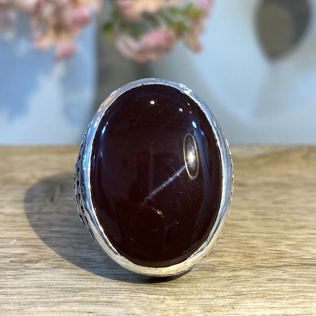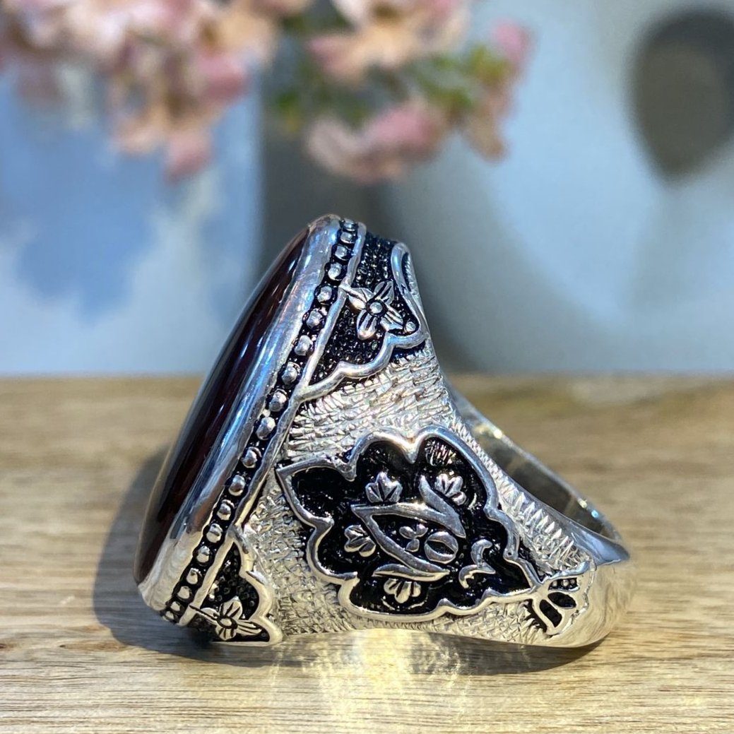 خاتم رجالي مميز يتوسطه حجر عقيق كَزَري طبيعي بلمعانه الساحر وتدرجاته الفريدة، مصاغ بعناية على قاعدة من فضة عيار 950 بتصميم أنيق يعكس الأصالة والرقي. قطعة تضفي لمسة فخامة استثنائية وتُبرز شخصية الرجل ذو الذوق الرفيع في إطلالاته اليومية والمناسبات الخاصة.