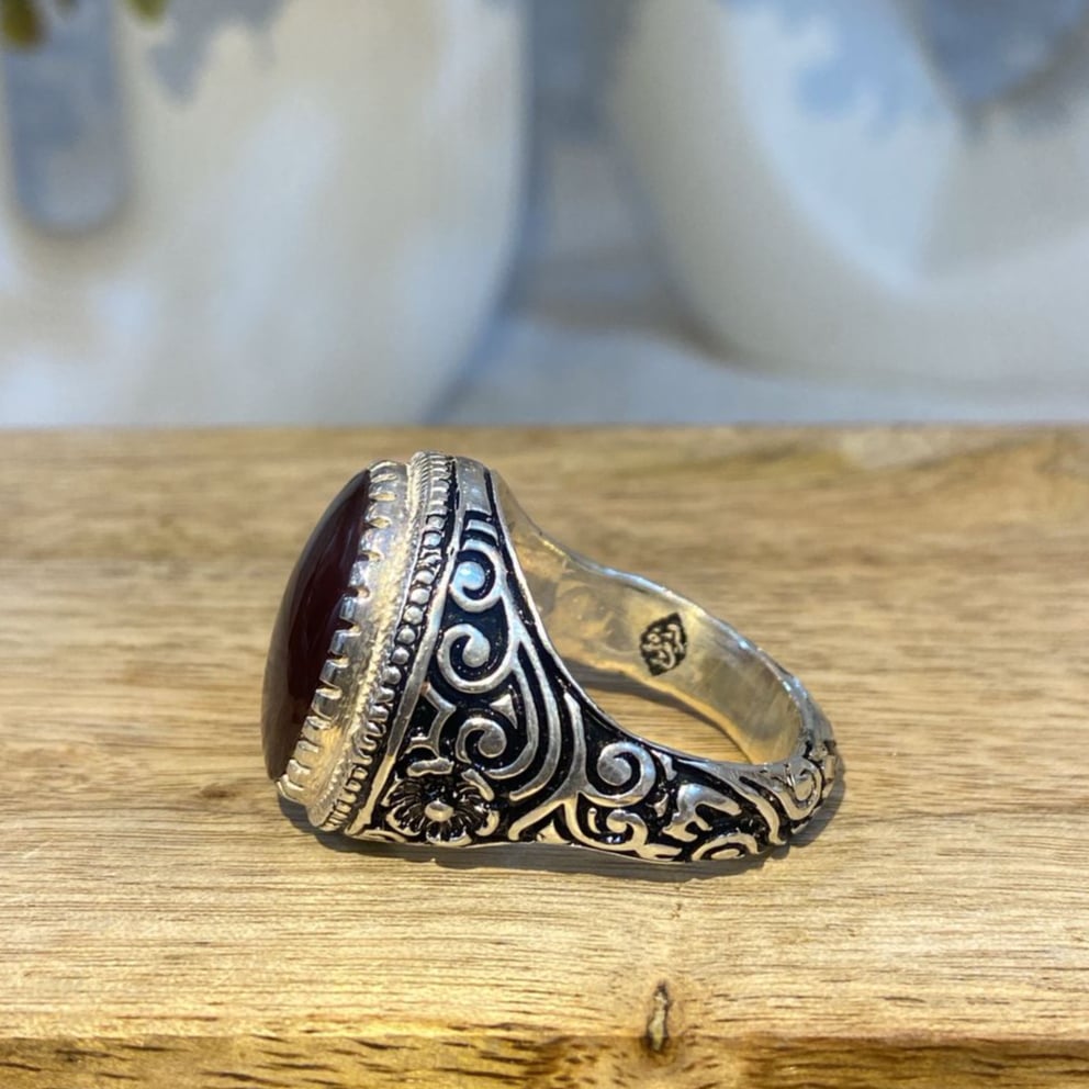 خاتم رجالي مميز يتوسطه حجر عقيق كَزَري طبيعي بلمعانه الساحر وتدرجاته الفريدة، مصاغ بعناية على قاعدة من فضة عيار 950 بتصميم أنيق يعكس الأصالة والرقي. قطعة تضفي لمسة فخامة استثنائية وتُبرز شخصية الرجل ذو الذوق الرفيع في إطلالاته اليومية والمناسبات الخاصة.