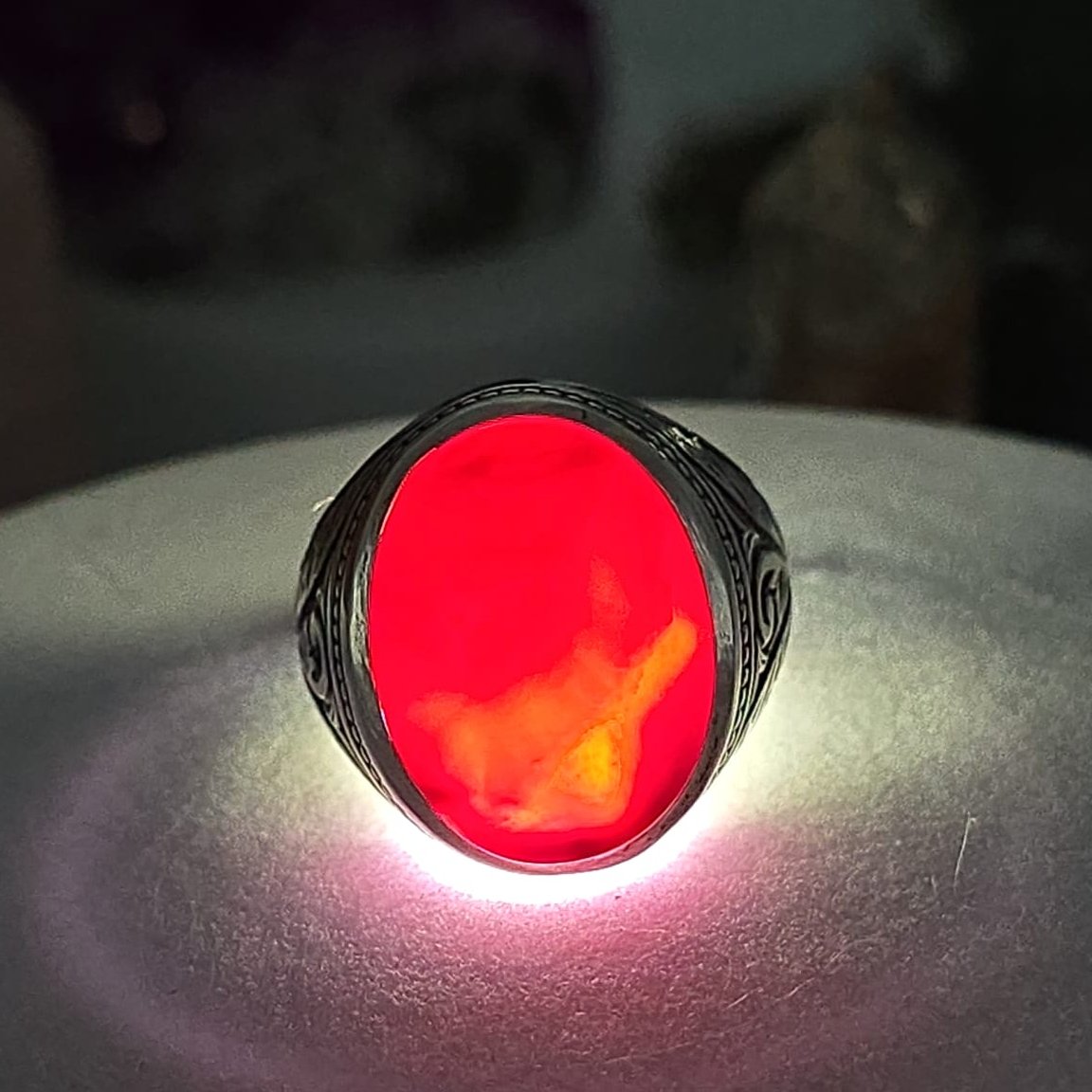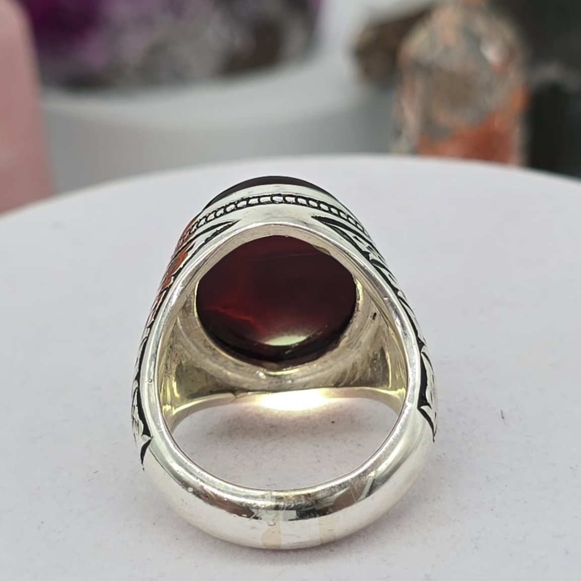 خاتم رجالي مميز يتوسطه حجر عقيق كَزَري طبيعي بلمعانه الساحر وتدرجاته الفريدة، مصاغ بعناية على قاعدة من فضة عيار 950 بتصميم أنيق يعكس الأصالة والرقي. قطعة تضفي لمسة فخامة استثنائية وتُبرز شخصية الرجل ذو الذوق الرفيع في إطلالاته اليومية والمناسبات الخاصة.