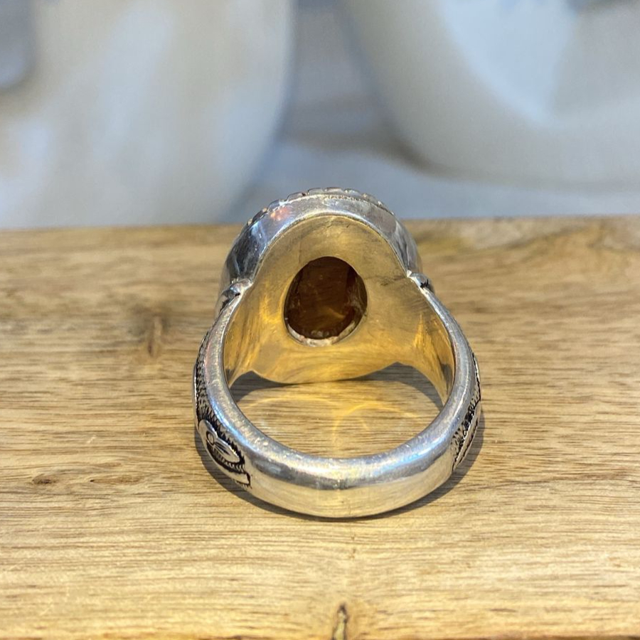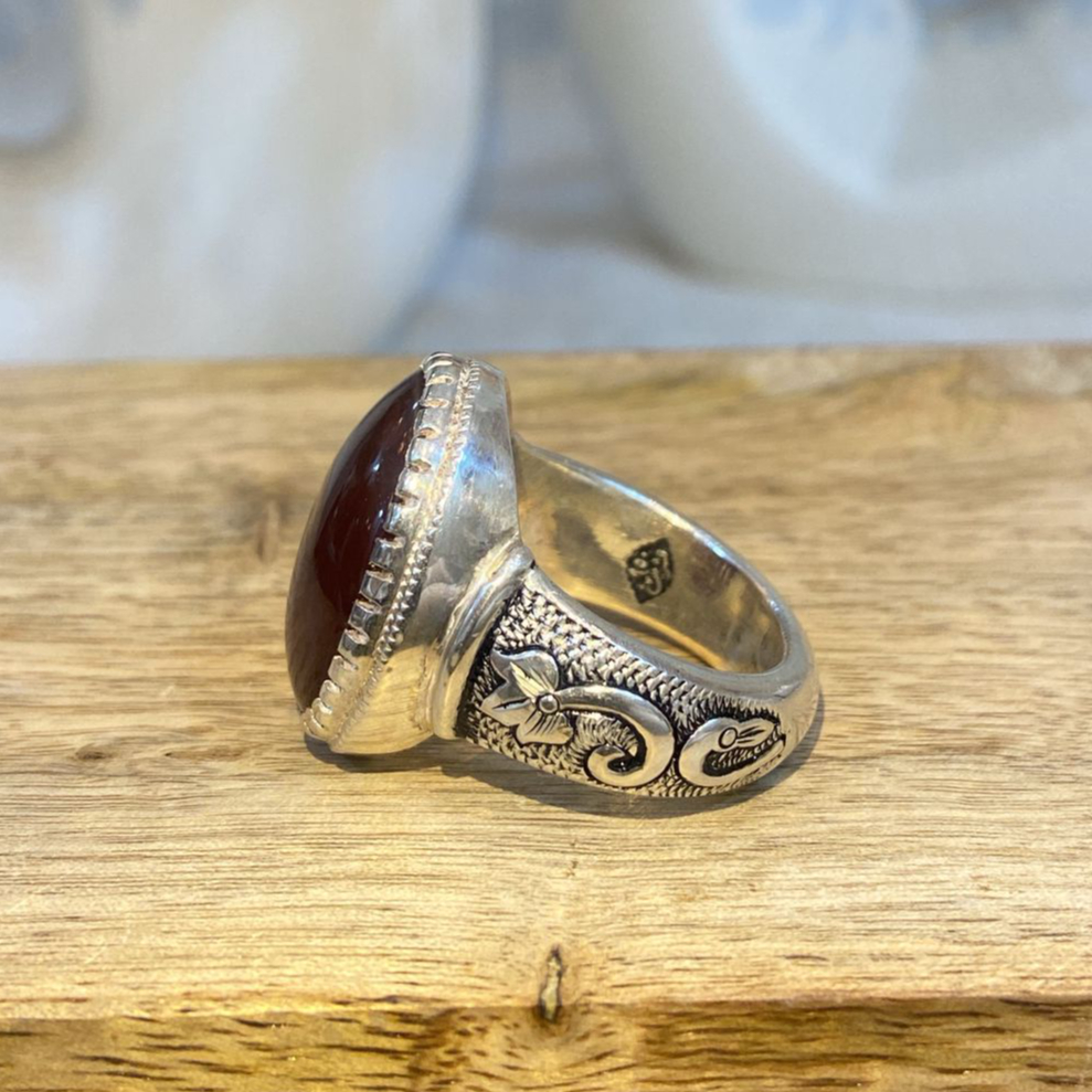 خاتم رجالي مميز يتوسطه حجر عقيق كَزَري طبيعي بلمعانه الساحر وتدرجاته الفريدة، مصاغ بعناية على قاعدة من فضة عيار 950 بتصميم أنيق يعكس الأصالة والرقي. قطعة تضفي لمسة فخامة استثنائية وتُبرز شخصية الرجل ذو الذوق الرفيع في إطلالاته اليومية والمناسبات الخاصة.