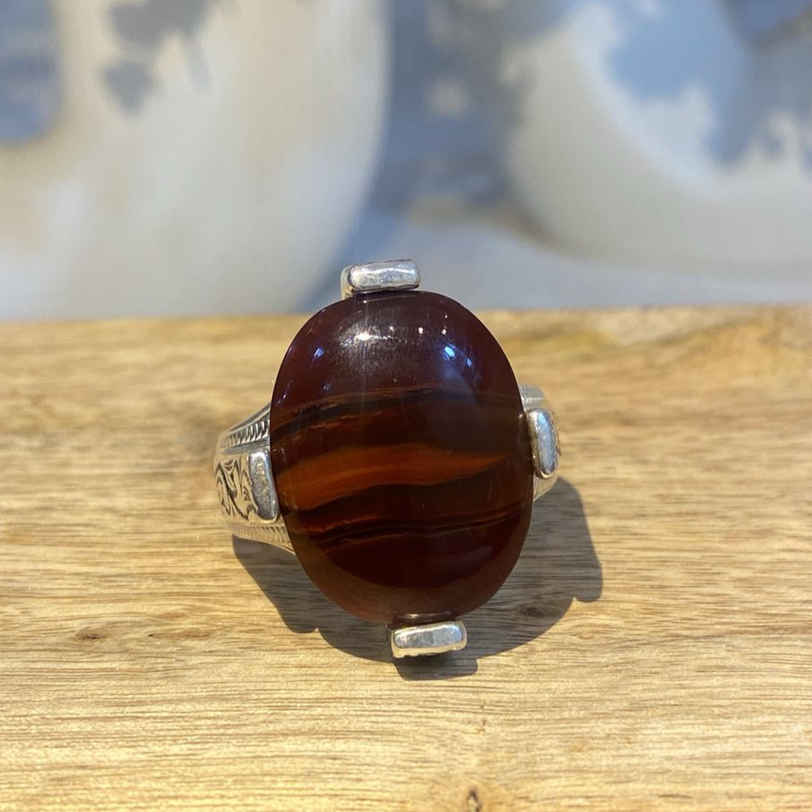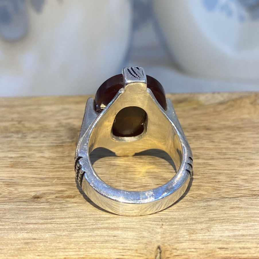 خاتم رجالي مميز يتوسطه حجر عقيق كَزَري طبيعي بلمعانه الساحر وتدرجاته الفريدة، مصاغ بعناية على قاعدة من فضة عيار 950 بتصميم أنيق يعكس الأصالة والرقي. قطعة تضفي لمسة فخامة استثنائية وتُبرز شخصية الرجل ذو الذوق الرفيع في إطلالاته اليومية والمناسبات الخاصة.