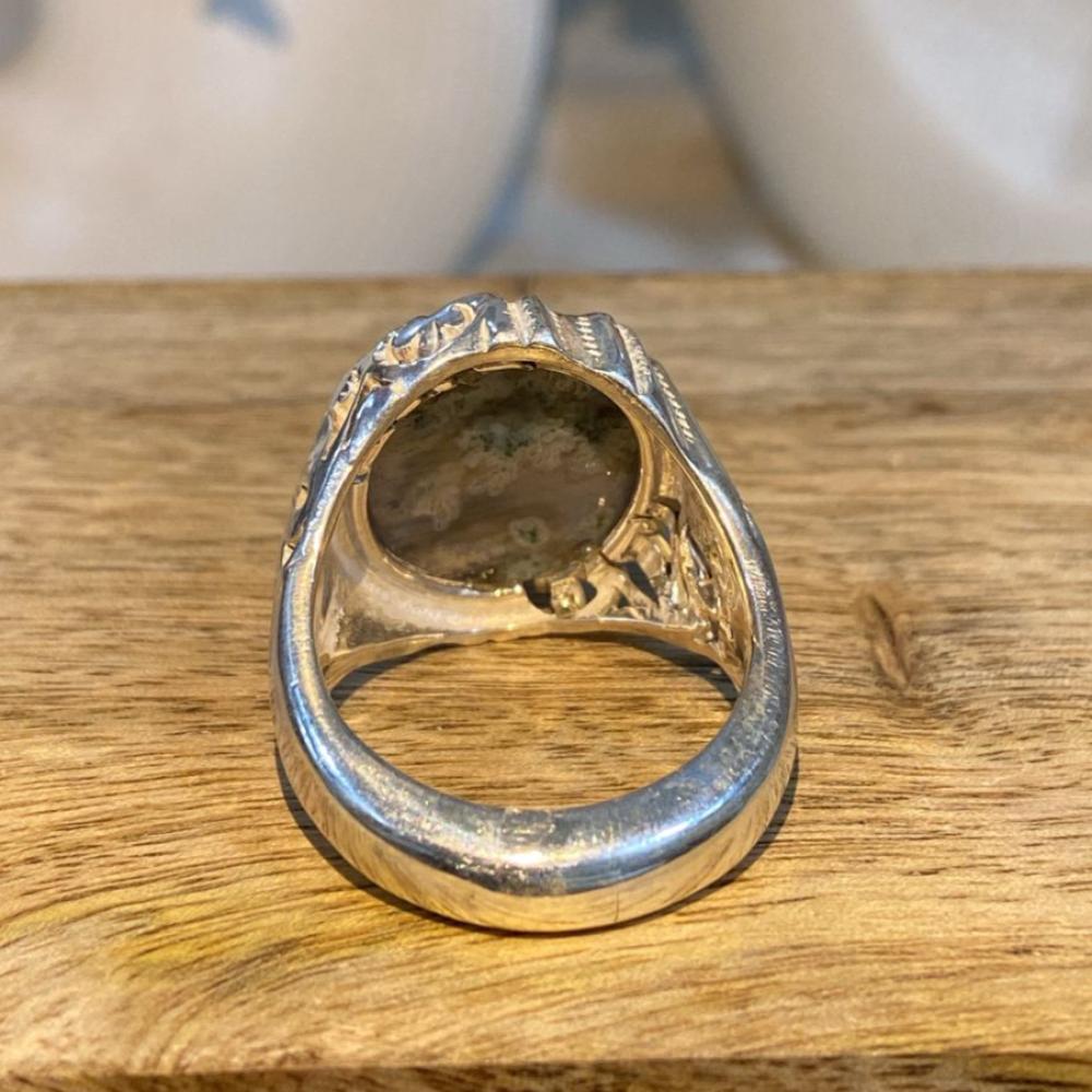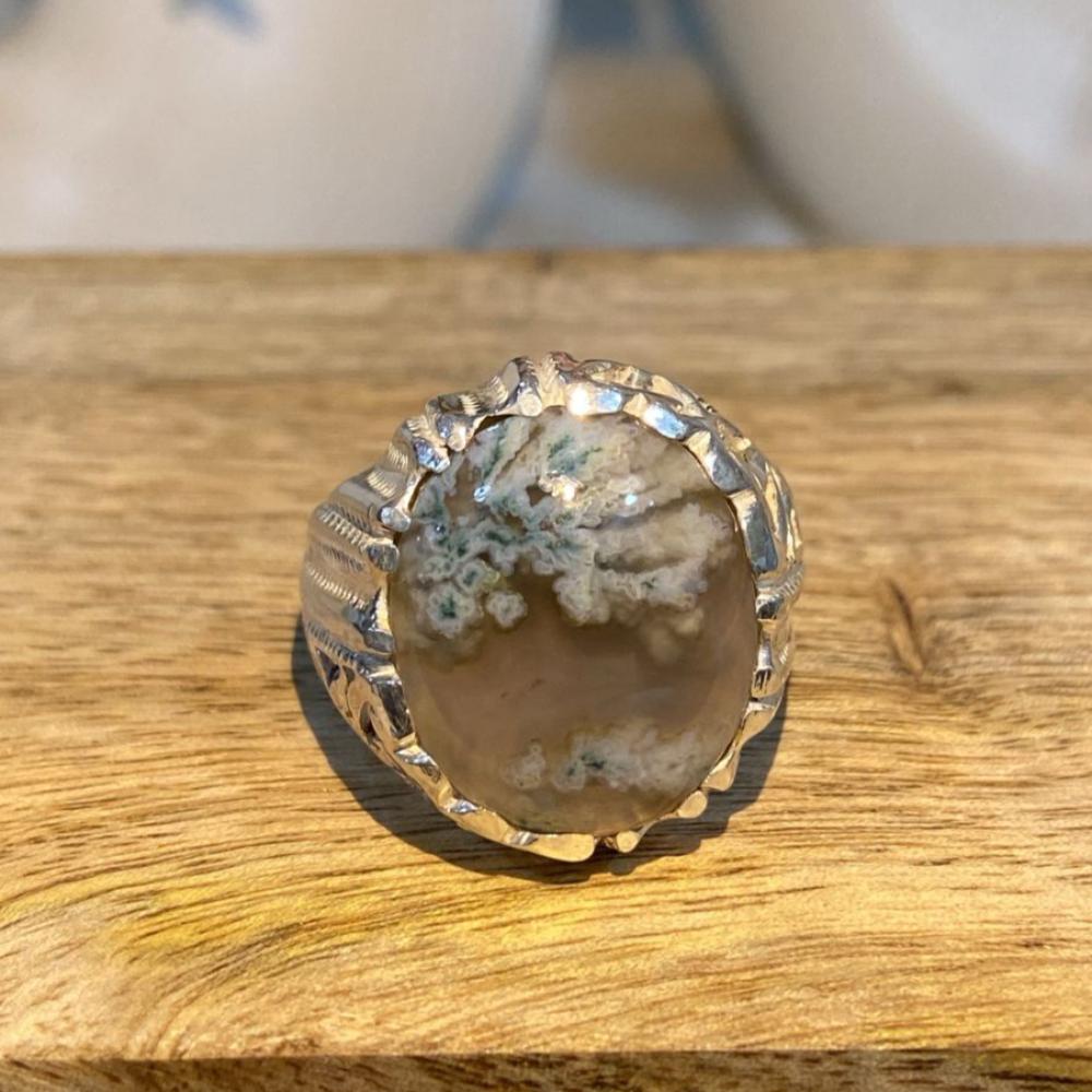 خاتم رجالي فاخر يتوسطه حجر عقيق ورد الربيع الطبيعي بألوانه الناعمة التي تحاكي تفتح الزهور، مصاغ على قاعدة من فضة عيار 950 بتصميم شرقي أنيق يناسب الرجل ذو الذوق الرفيع. قطعة تعبّر عن التفرد والجاذبية وتُضفي حضورًا راقيًا على الإطلالة اليومية والمناسبات الخاصة.