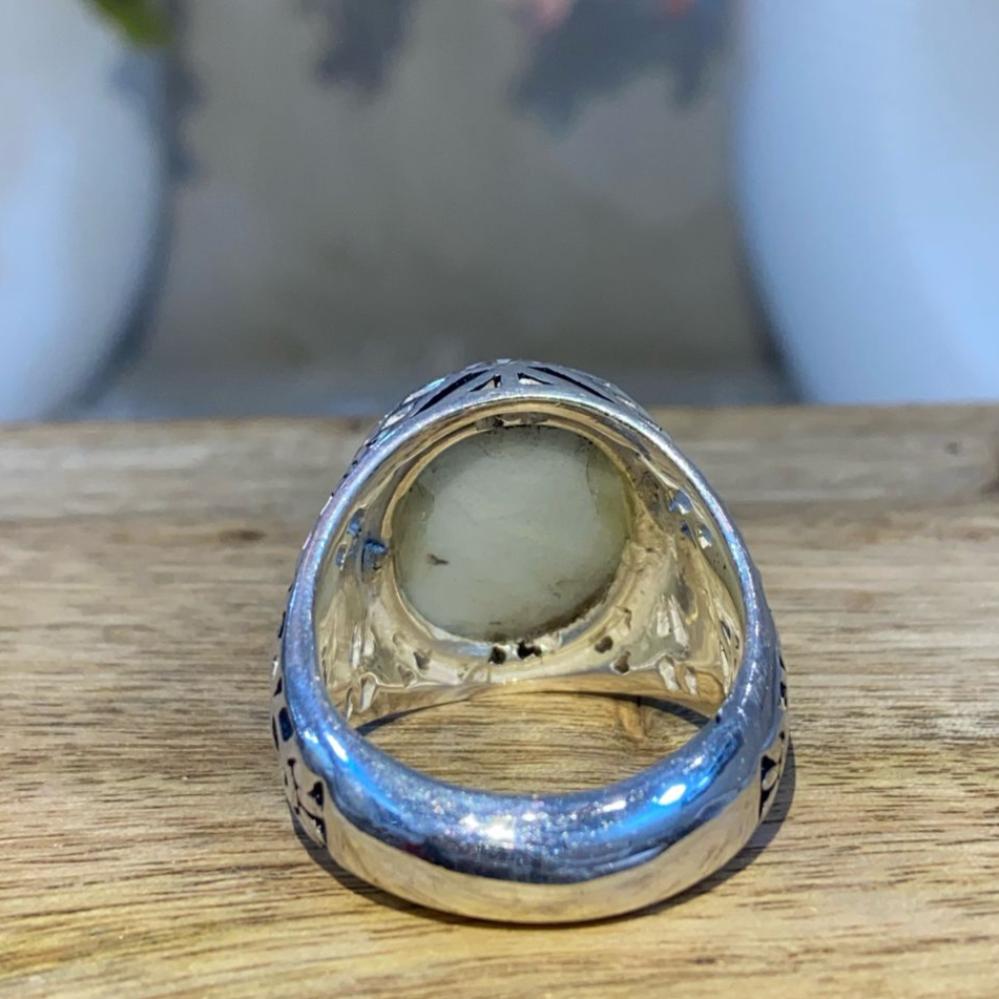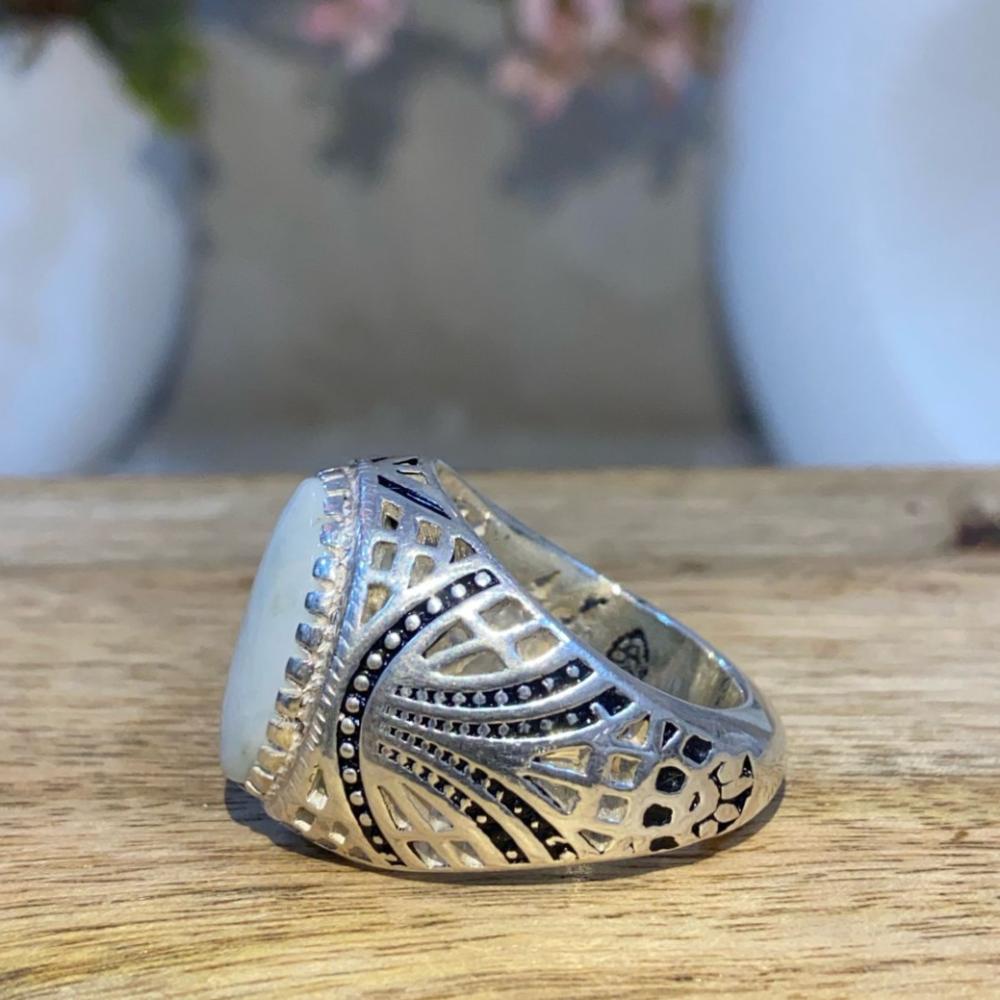 خاتم رجالي أنيق مرصع بحجر العقيق اليماني الأبيض الطبيعي الذي يرمز للنقاء والسلام الداخلي.