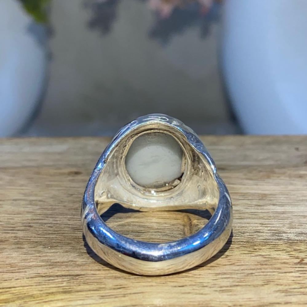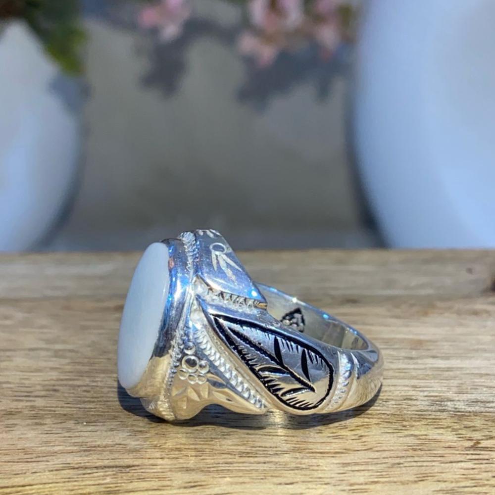 خاتم رجالي أنيق مرصع بحجر العقيق اليماني الأبيض الطبيعي الذي يرمز للنقاء والسلام الداخلي.
