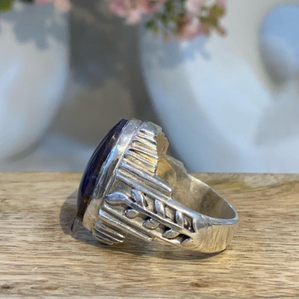 خاتم أنيق بحجر عقيق يماني طبيعي بدرجة بنفسجية ساحرة تتخللها خطوط ذهبية براقة، مصاغ على قاعدة من فضة 999 عالية الجودة.