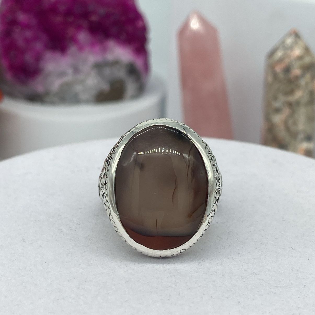 خاتم رجالي أنيق يتوسطه حجر عقيق يماني طبيعي، مصاغ على قاعدة من فضة عيار 950بتصميم شرقي فاخر يُبرز جمال الحجر وعمقه الطبيعي. قطعة فريدة تعكس التفرد والأصالة، وتضفي حضورًا راقيًا سواء في الإطلالة اليومية أو المناسبات الخاصة مميز بنقش ورود على الفضة.