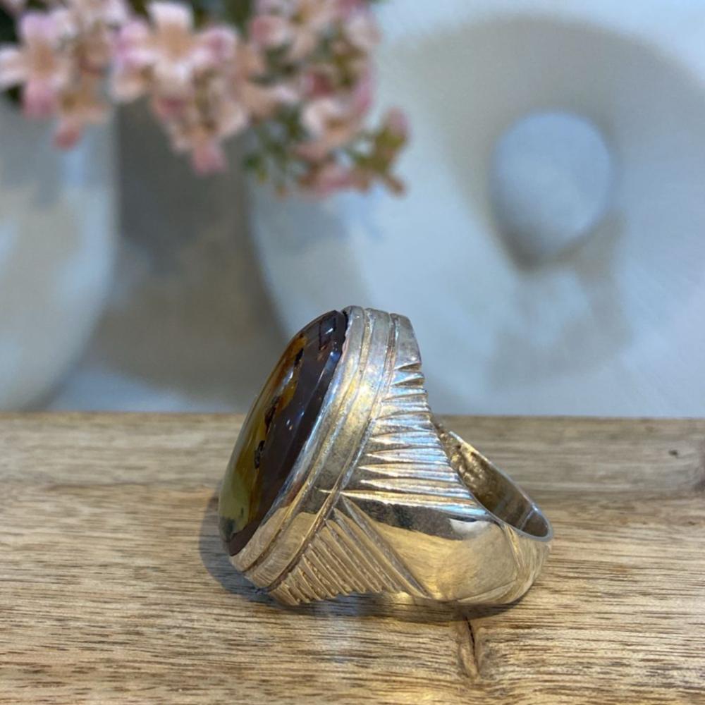 خاتم رجالي أنيق يتوسطه حجر عقيق يماني طبيعي، مصاغ على قاعدة من فضة عيار 925 بتصميم شرقي فاخر يُبرز جمال الحجر وعمقه الطبيعي. قطعة فريدة تعكس التفرد والأصالة، وتضفي حضورًا راقيًا سواء في الإطلالة اليومية أو المناسبات الخاصة.