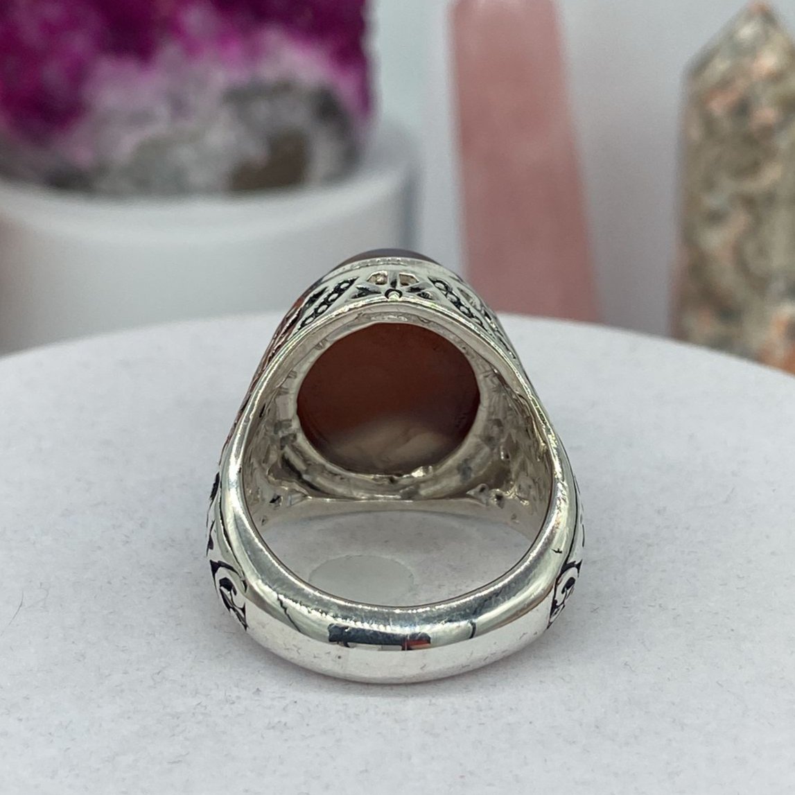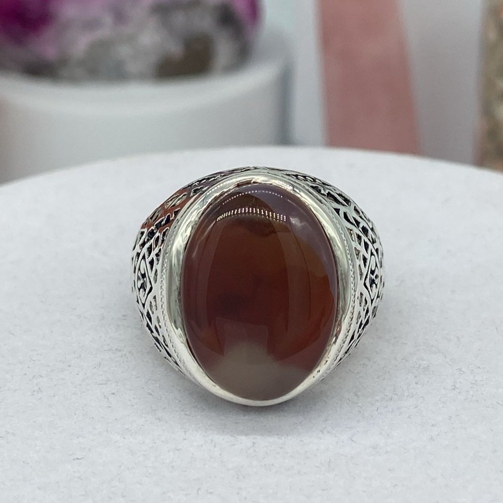 خاتم رجالي أنيق يتوسطه حجر عقيق يماني طبيعي، مصاغ على قاعدة من فضة عيار 950بتصميم شرقي فاخر يُبرز جمال الحجر وعمقه الطبيعي. قطعة فريدة تعكس التفرد والأصالة، وتضفي حضورًا راقيًا سواء في الإطلالة اليومية أو المناسبات الخاصة مميز بنقش ورود على الفضة.