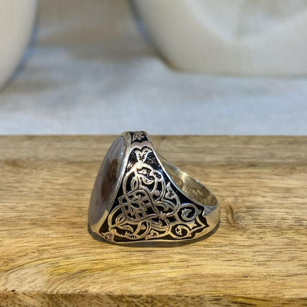 خاتم رجالي فخم يتوسطه حجر عقيق يماني طبيعي مصوّر، مصاغ على قاعدة من فضة عيار 925 بتصميم شرقي أنيق يُبرز فخامة الحجر. قطعة نادرة تعكس التفرد والأصالة، وتضفي حضورًا جذّابًا سواء في الإطلالة اليومية أو المناسبات الخاصة.