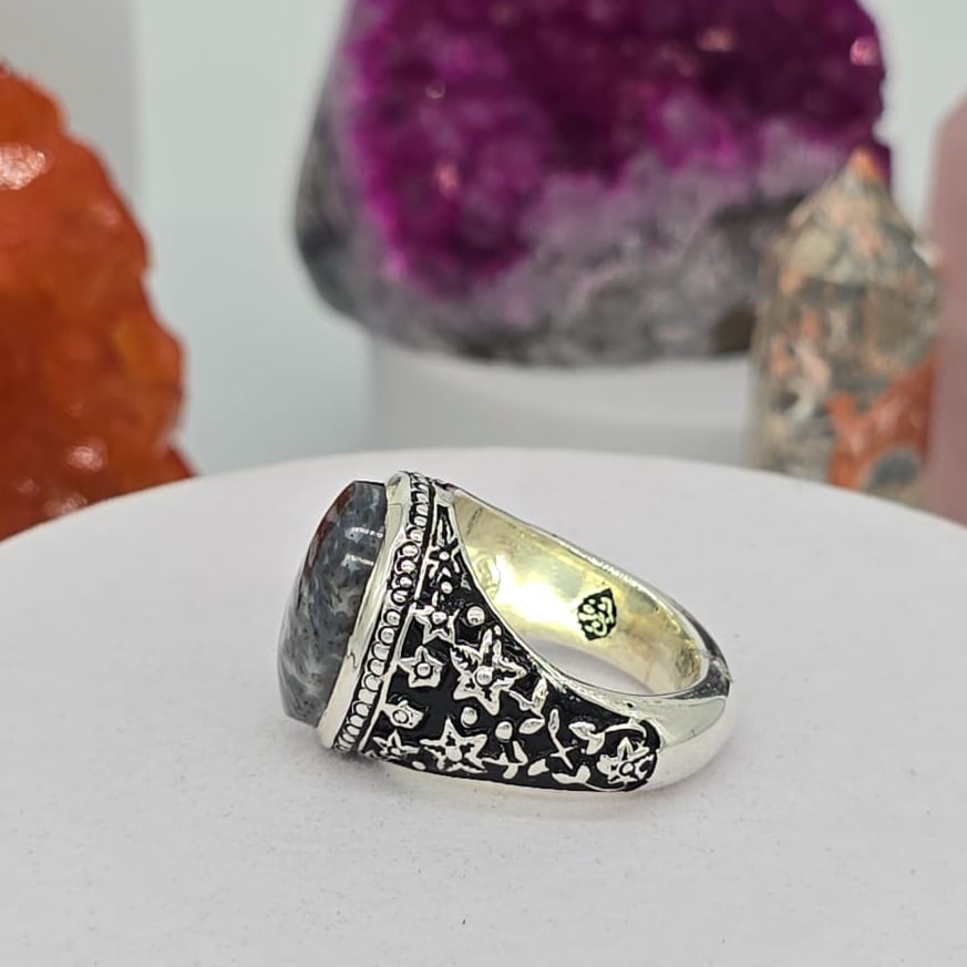 خاتم رجالي فاخر بحجر عقيق يماني طبيعي أصيل، يتميز بجمال نقوشه وألوانه المميزة.